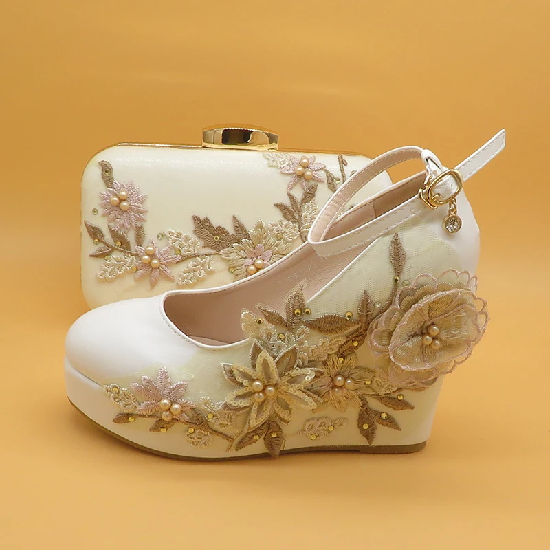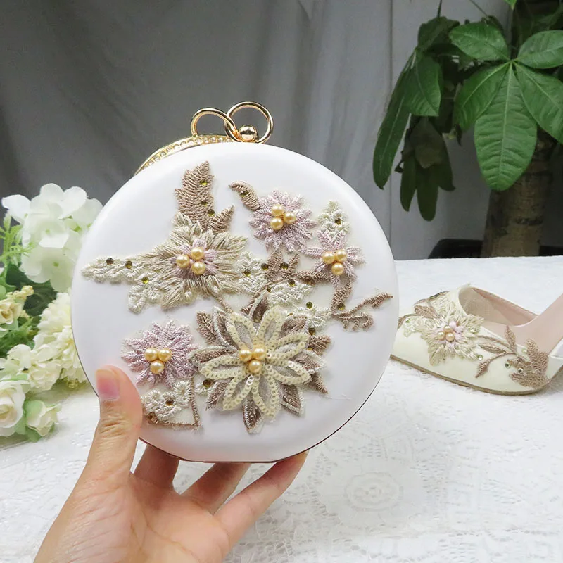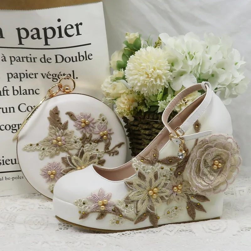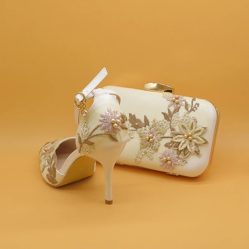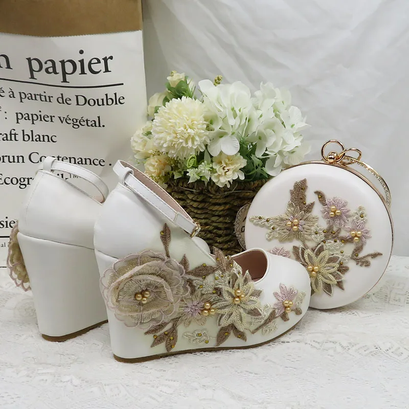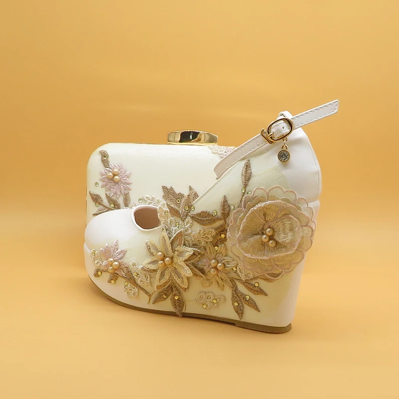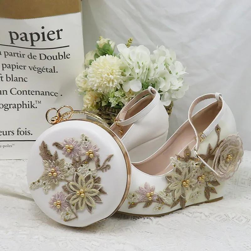 Женские свадебные туфли на высоком каблуке, белые туфли с цветочным кружевом и подходящими сумками, комплект из туфель и сумки с острым носком и ремешком на щиколотке для вечеринки, 2021