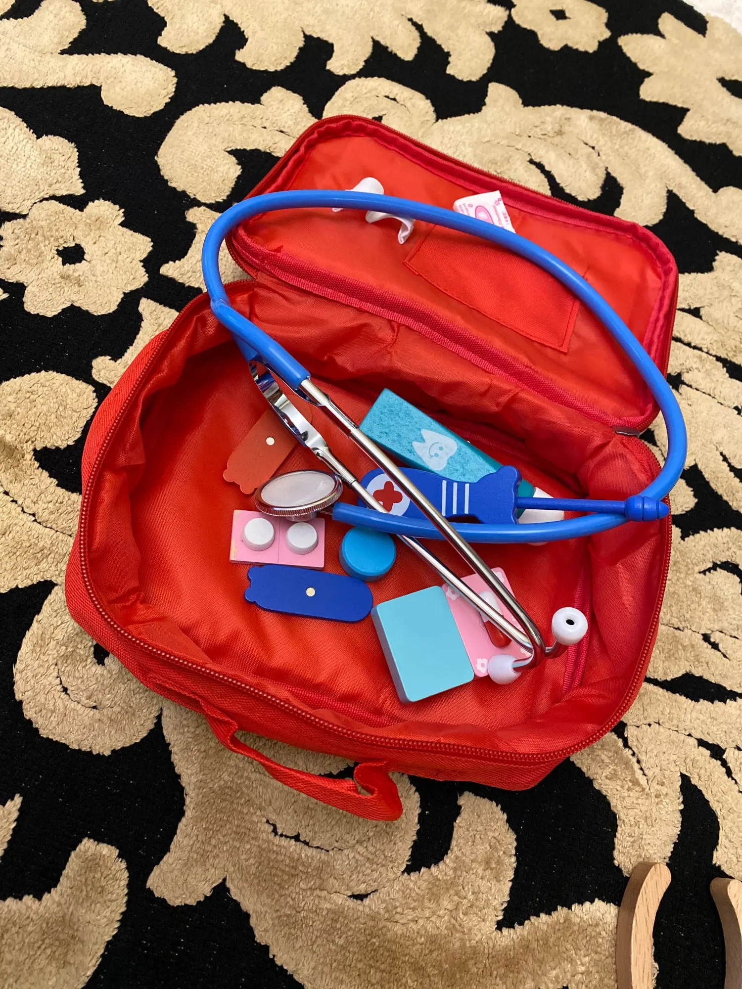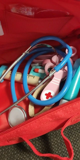 Замечательный набор. Много деревянных деталей, стетоскоп настоящий, действительно прослушать им можно.