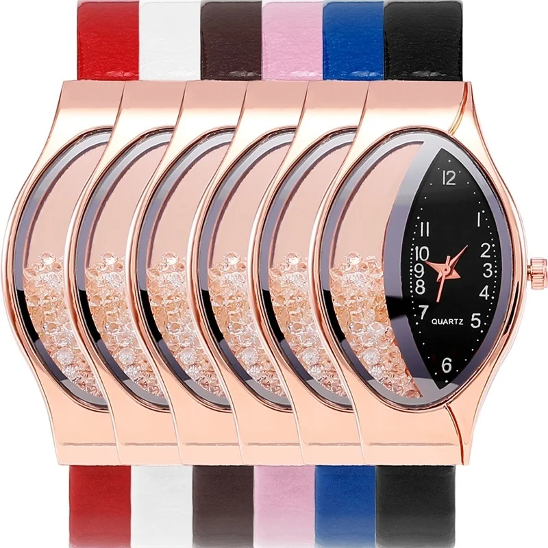 Повседневные женские часы Овальный циферблат наручные часы кожи со стразами, дизайнерские женские часы платье Gfit Montre Femme reloj mujer Часовой механизм: кварцевый