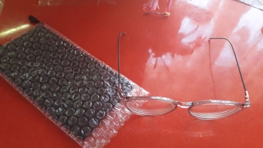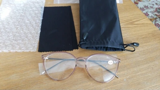Очки хорошенькие, не хлипкие. Дужки тоненькие, но тоже выглядят качественно. Не давят на виски (было главным критерием для меня). На круглое лицо очки не давят на щёки, что у меня часто бывает. Не свисают. В общем, очень понравились. Плюс ещё чехольчик тканевый и тряпочка в комплекте.