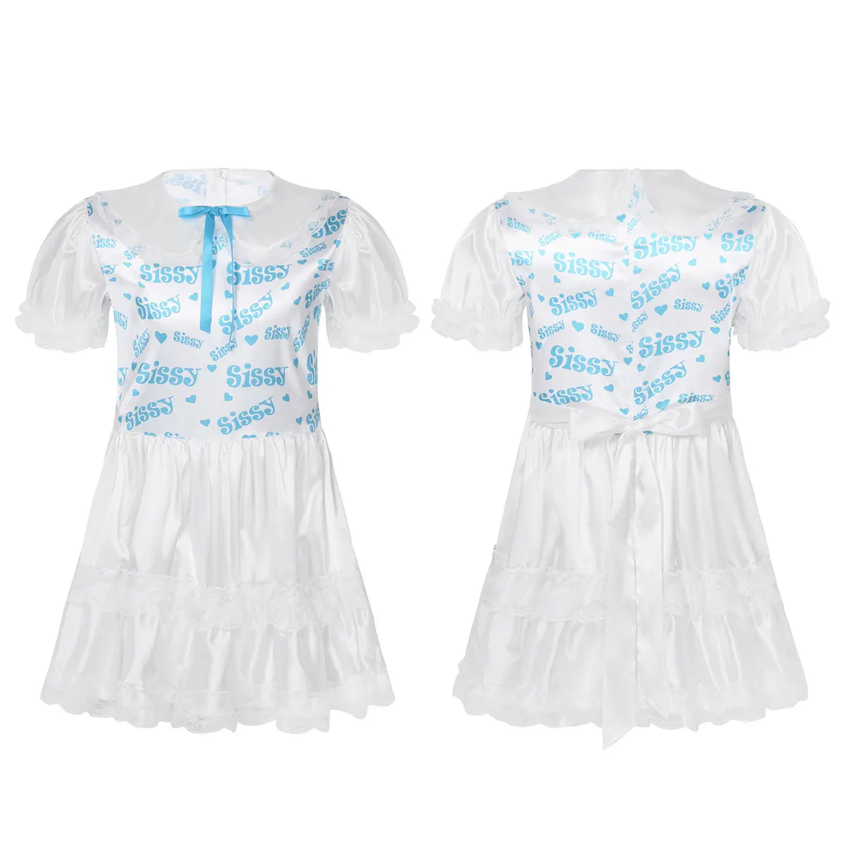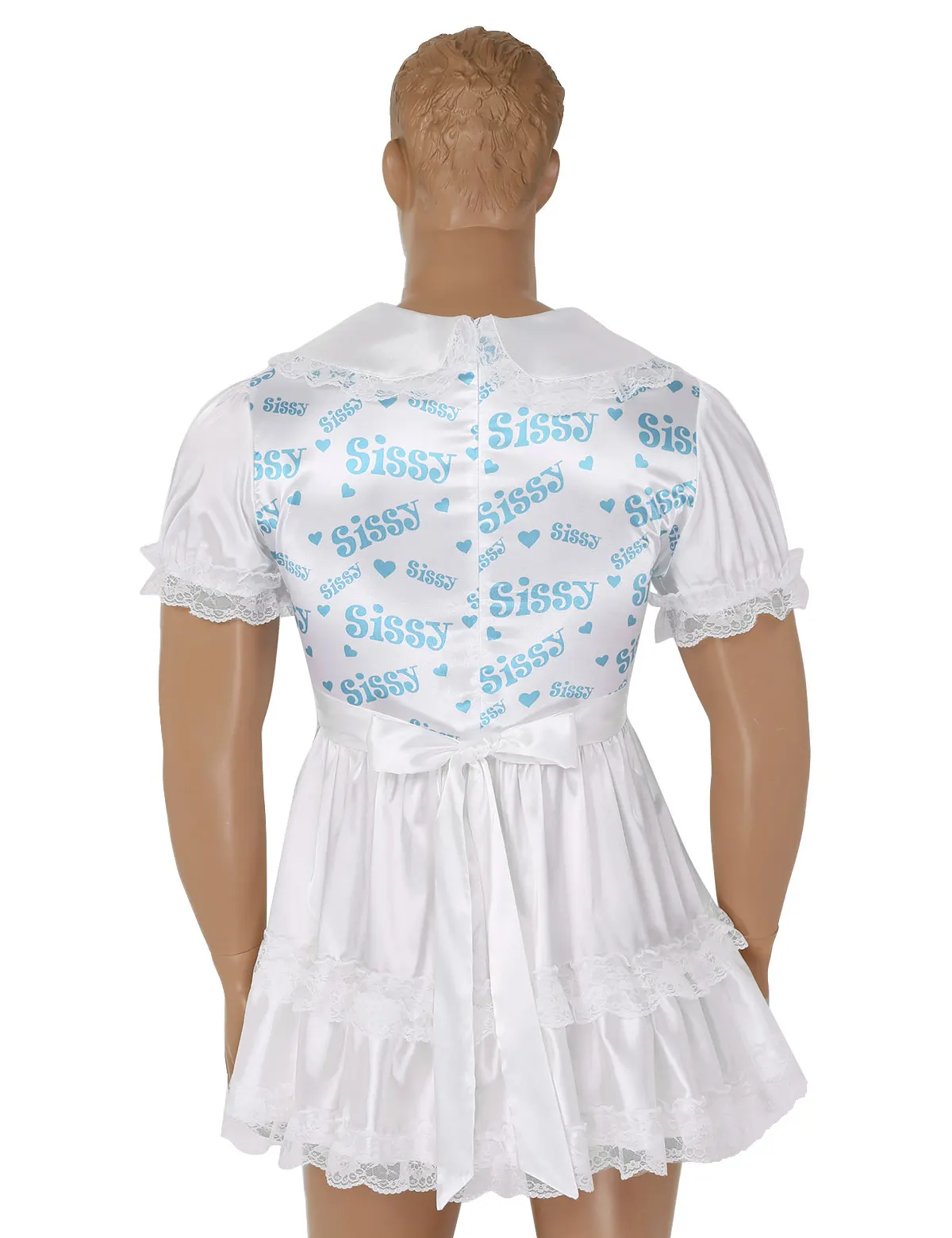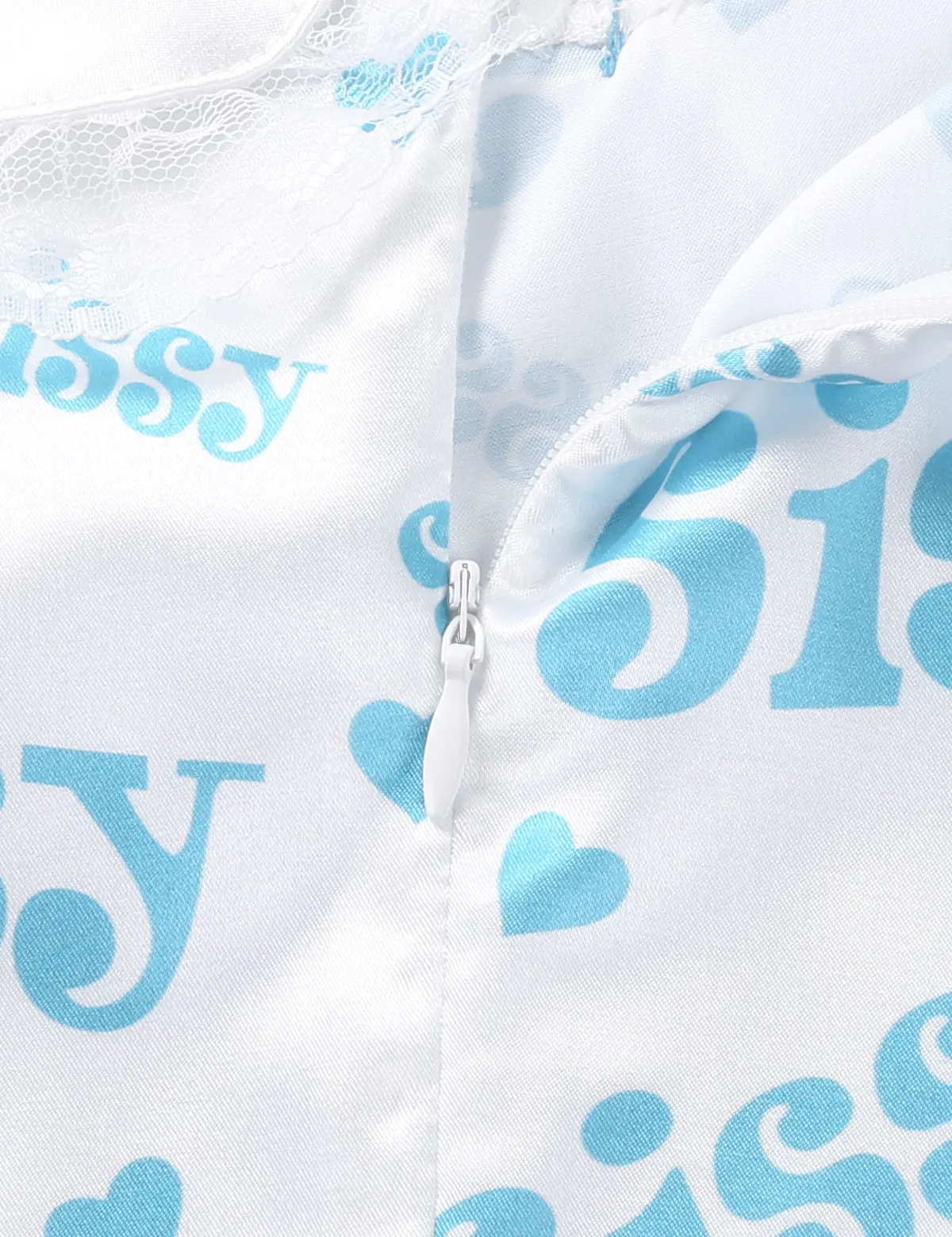 Кукольный воротник и короткие пышные рукава, отделанные изящным кружевом, Полный лиф с принтом «sissy» сверху, с боковыми лентами на спине.