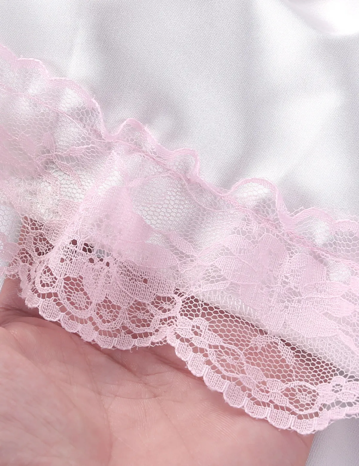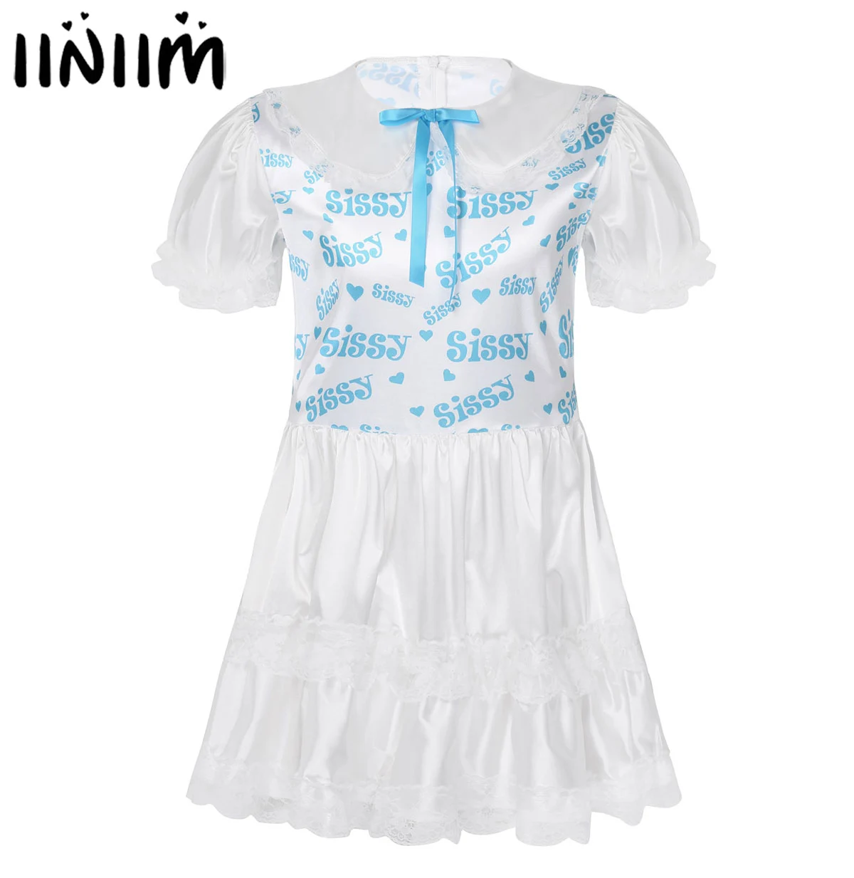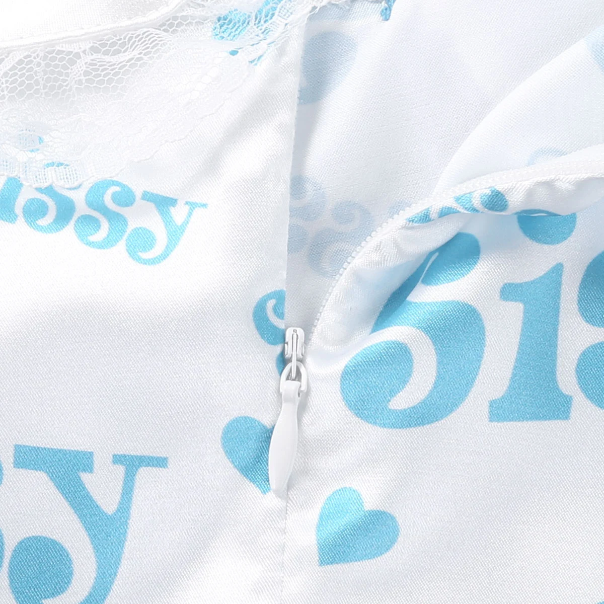 Кукольный воротник и короткие пышные рукава, отделанные изящным кружевом, Полный лиф с принтом «sissy» сверху, с боковыми лентами на спине.