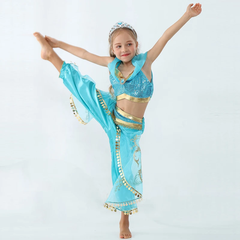 Для девочек, детское летнее платье с принцессой Жасмин платье для танцев костюм с рисунком "Аладдин" на Хэллоуин; Рождественское представление костюм топ и юбка-брюки комплект из двух предметов