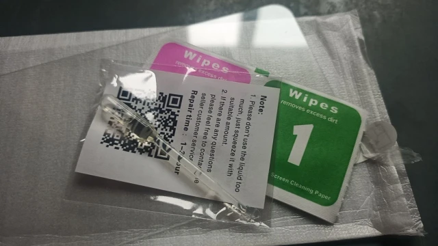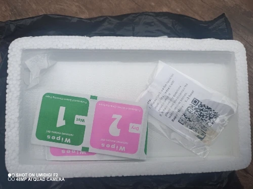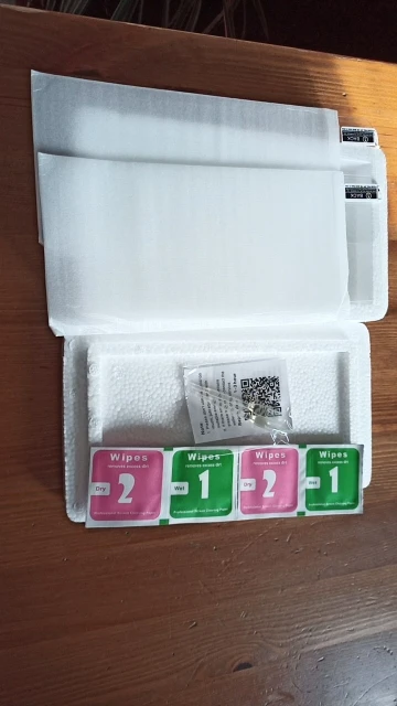 пришло всё вовремя, в комплекте две пипетки с жидкостью и салфетки. на телефон ещё не наклеивали.