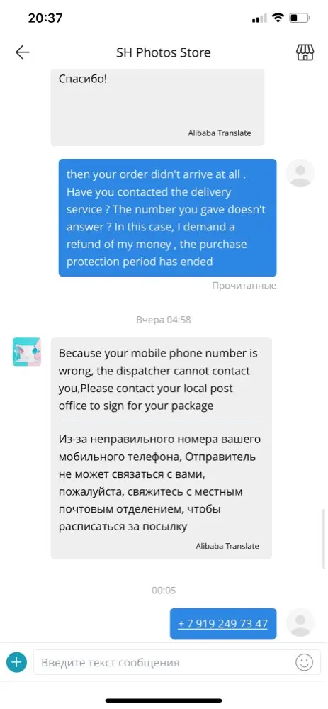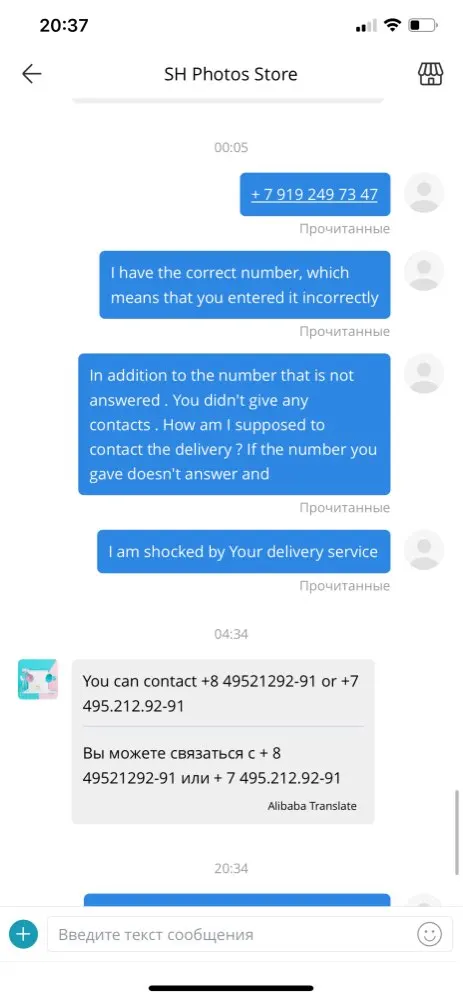 Просто отвратительный магазин . Не заказывайте у данного продавца . Он отправил мою посылку какой то непонятной службой Доставки . Номер телефона доставки был все время занят или перегружен . У службы доставки нет даже сайта . Мой заказ не пришёл и мне не вернули деньги . Just a disgusting store . Do not order from this seller . He sent my parcel to some unknown Delivery service . The delivery phone number was always busy or overloaded . The delivery service doesn't even have a website . My order didn't arrive and I didn't get a refund .