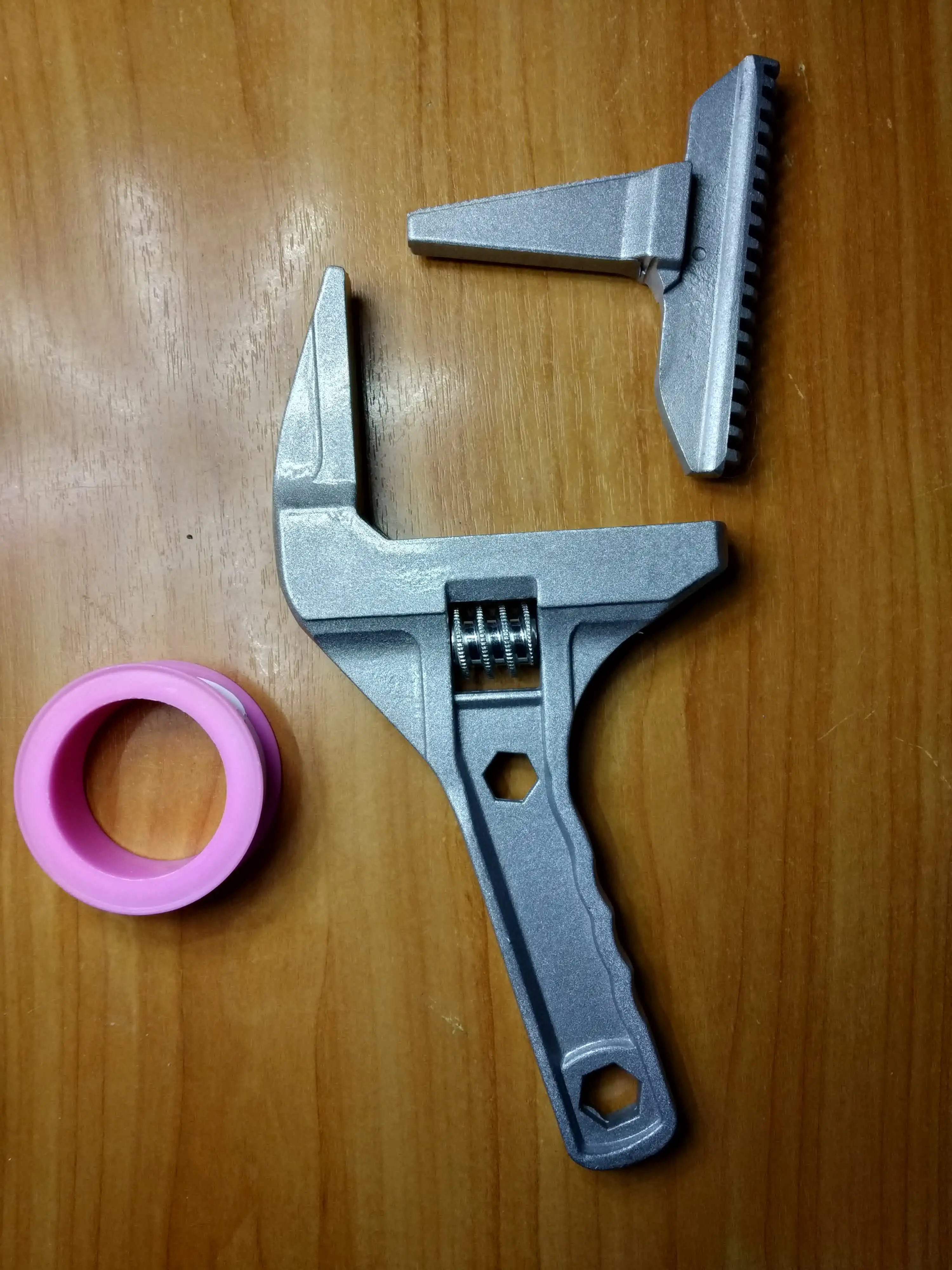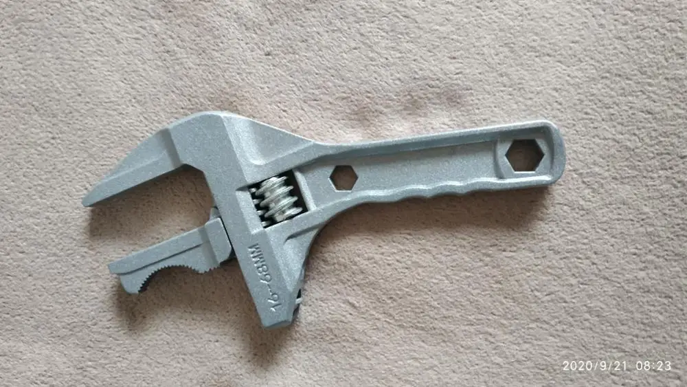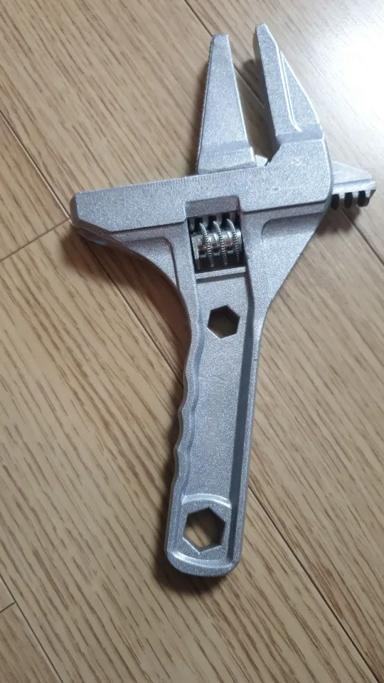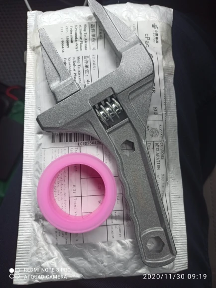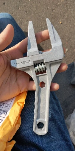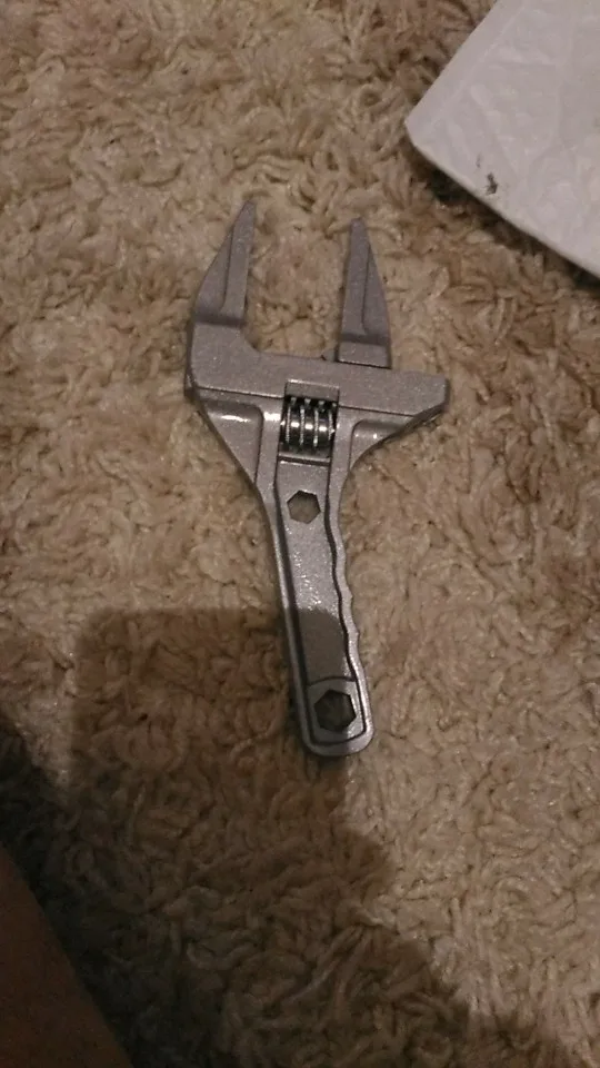 На вид ключ из силумина или алюминия. Очень лёгкий. В закрытом состоянии, губки не смыкаются до конца. Есть щель около 5 мм. В открытом состоянии подвижная часть слетает с резьбы и для сведения губок ключа приходится вручную подталкивать подвижную часть к началу резьбы. Очень большой люфт при движении. Качеством разочарован.