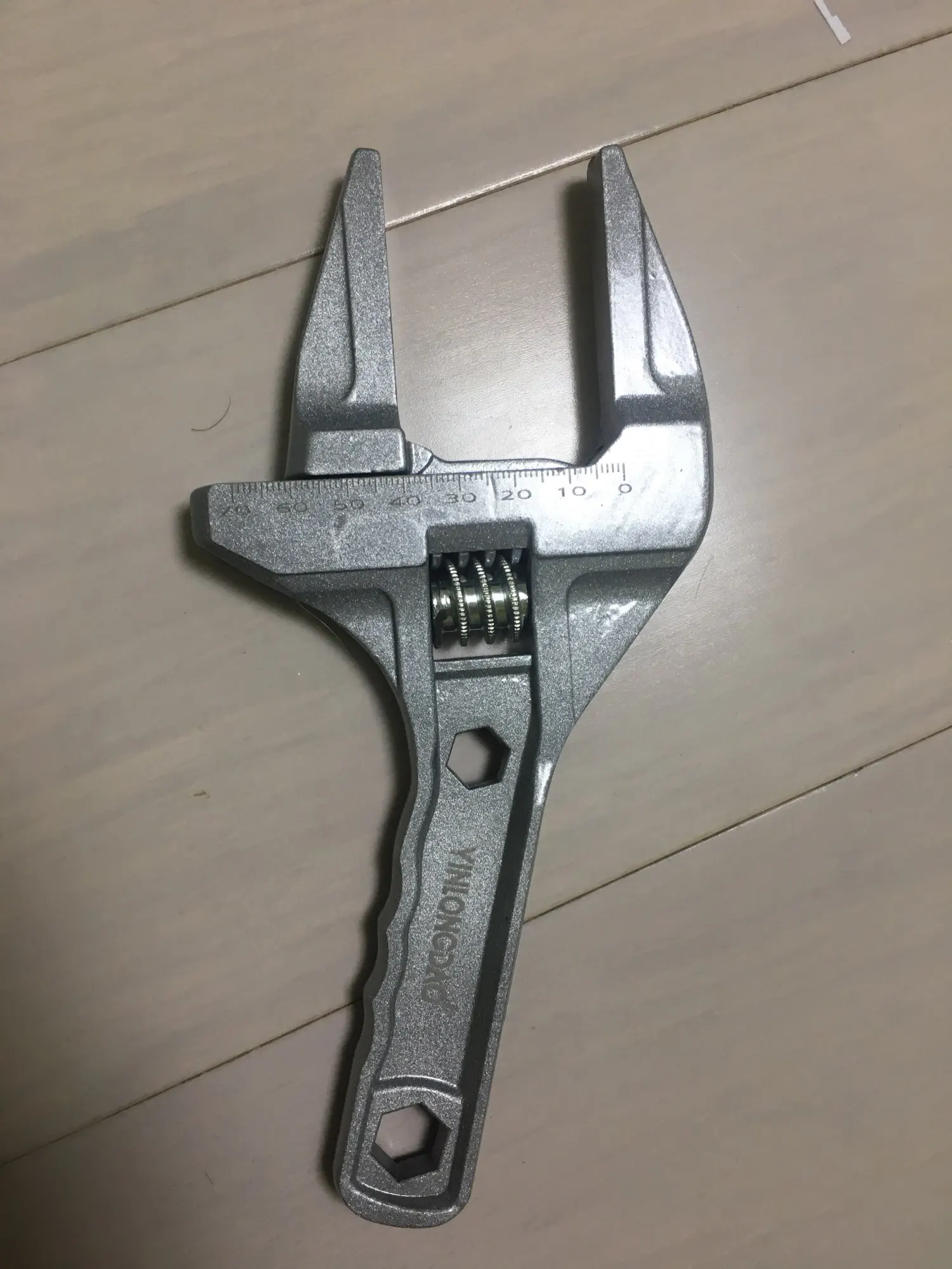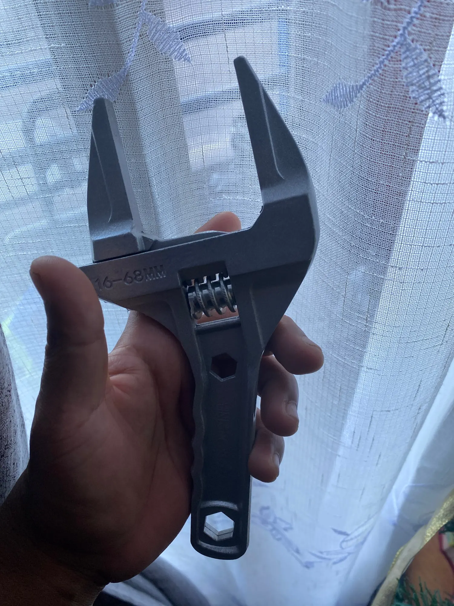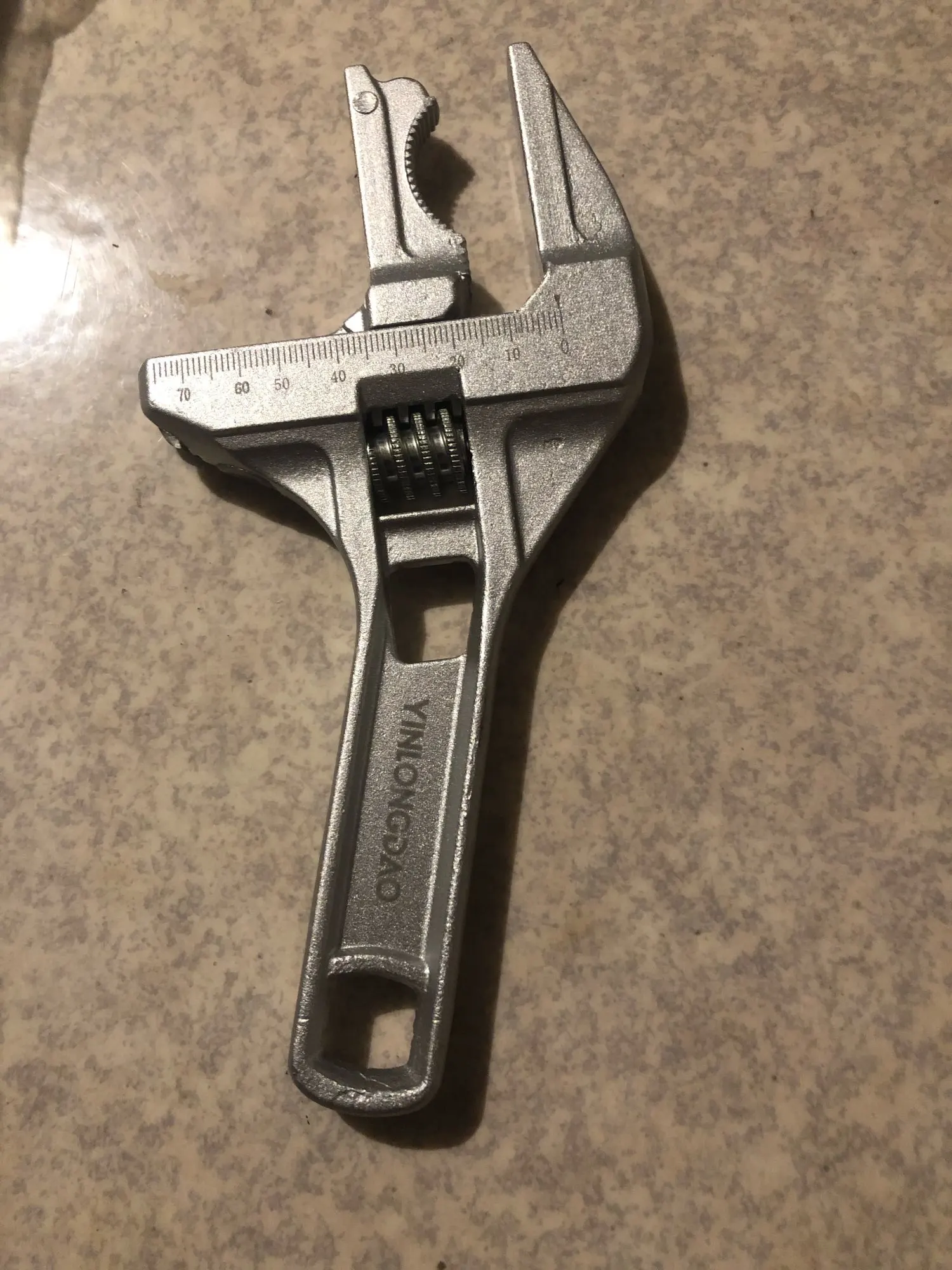 На вид ключ из силумина или алюминия. Очень лёгкий. В закрытом состоянии, губки не смыкаются до конца. Есть щель около 5 мм. В открытом состоянии подвижная часть слетает с резьбы и для сведения губок ключа приходится вручную подталкивать подвижную часть к началу резьбы. Очень большой люфт при движении. Качеством разочарован.