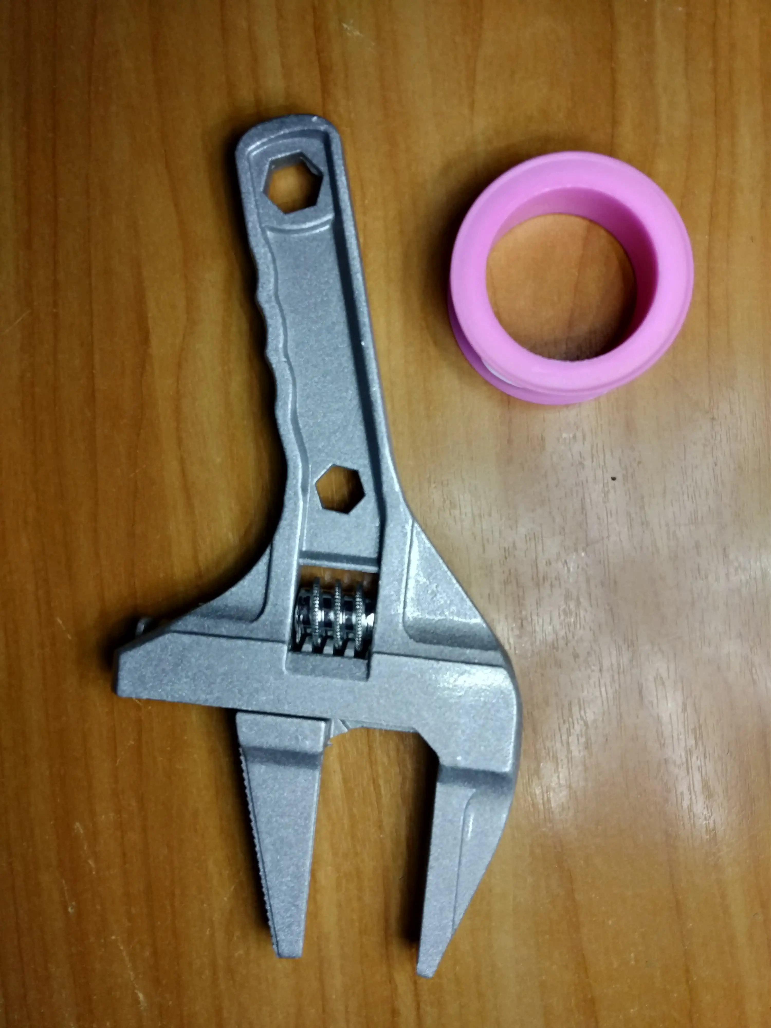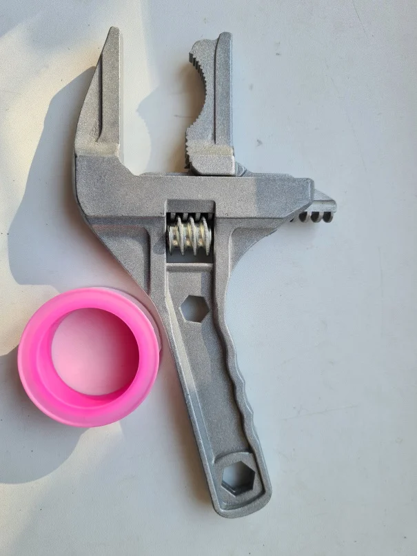 Ключ из силумина, если не крутить прикипевшие гайки больших диаметров и не удлинять ручку трубой, то прослужит он долго. Мы взяли его для закручивания пластиковых гаек большого диаметра, с этой задачей он прекрасно справляется.