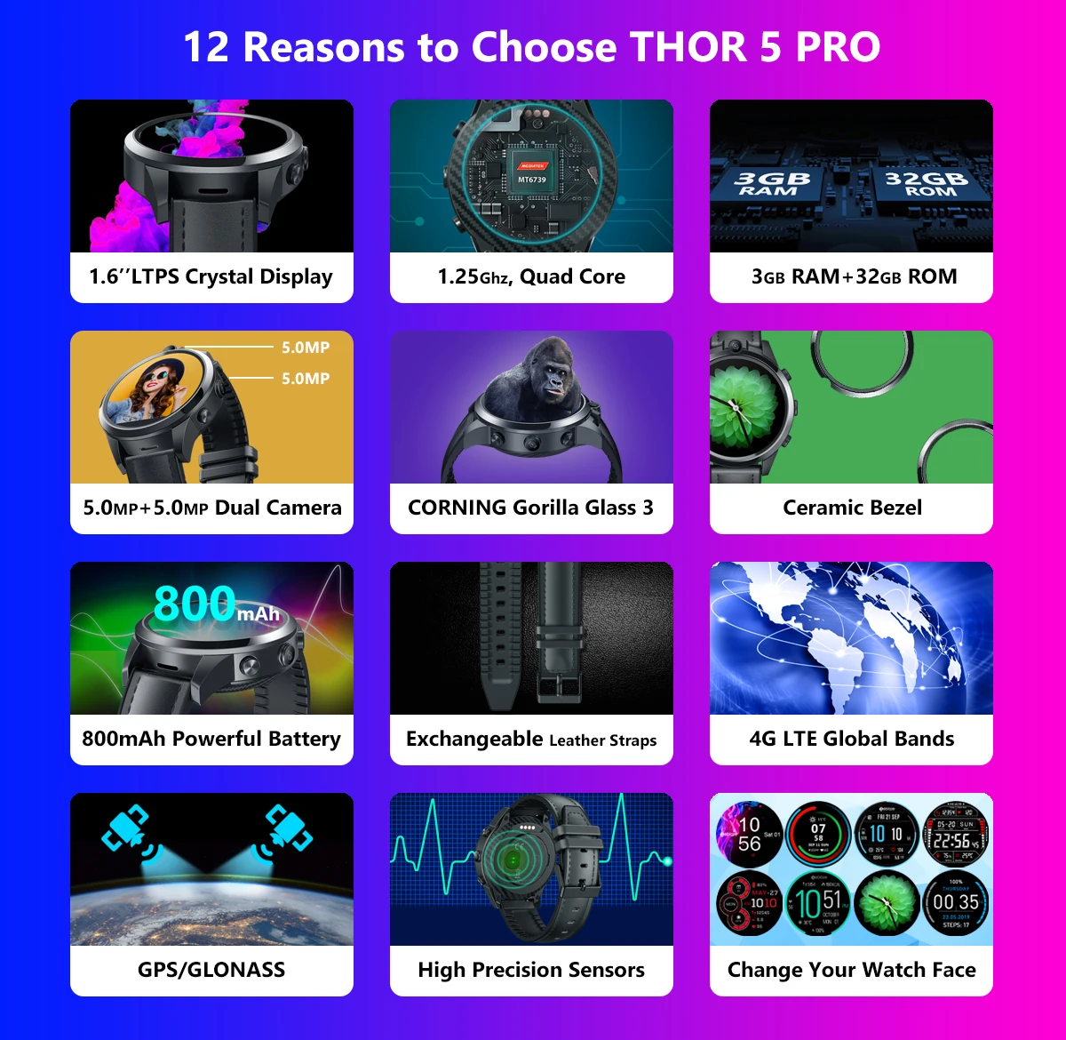 Смарт-часы Zeblaze THOR 5 PRO, GPS, 32 ГБ, Android, карты, умные часы, водонепроницаемая Sim Двойная камера, 800 мАч, pk thor 5, 4 pro, часы