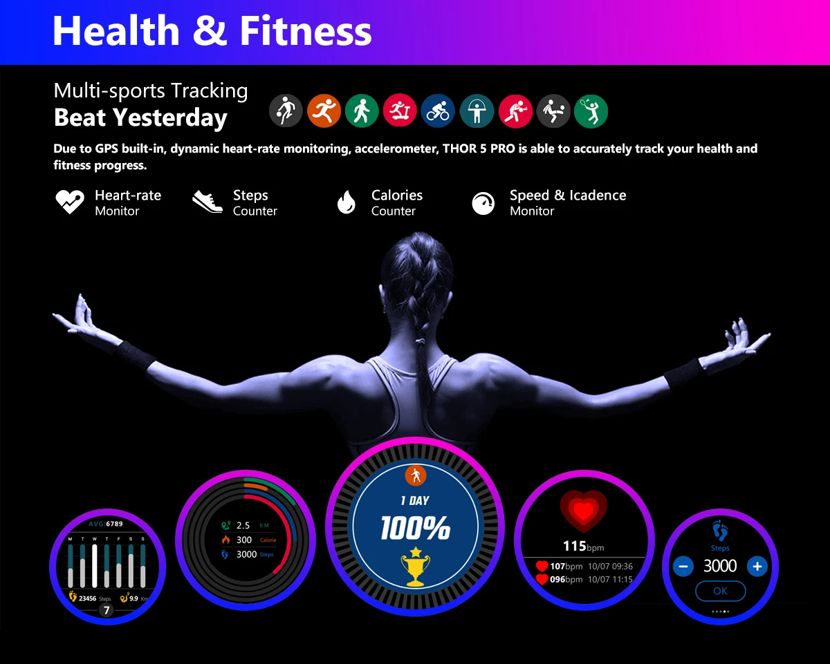 Мульти-Отслеживание занятий спортом Благодаря встроенному GPS динамическому контролю сердечного ритма, акселерометру, THOR 5 PRO способен точно отслеживать ваше здоровье и фитнес-прогресс.