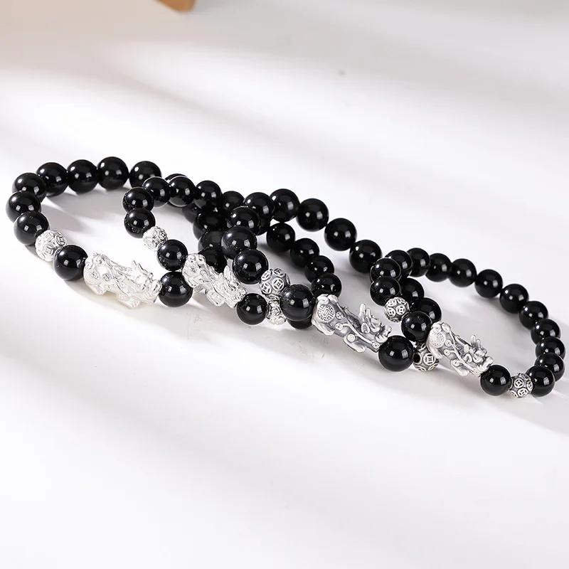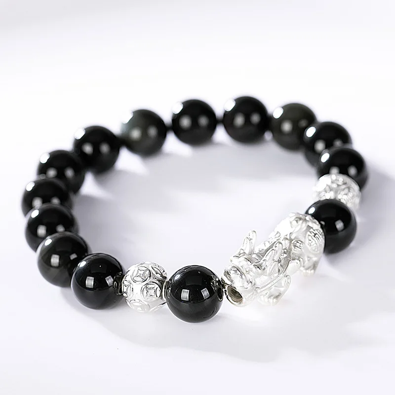 Браслеты из черного обсидиана для мужчин, ручные аксессуары из настоящего стерлингового серебра с кристаллами Pixiu Feng Shui, ювелирные изделия на руку для мужчин