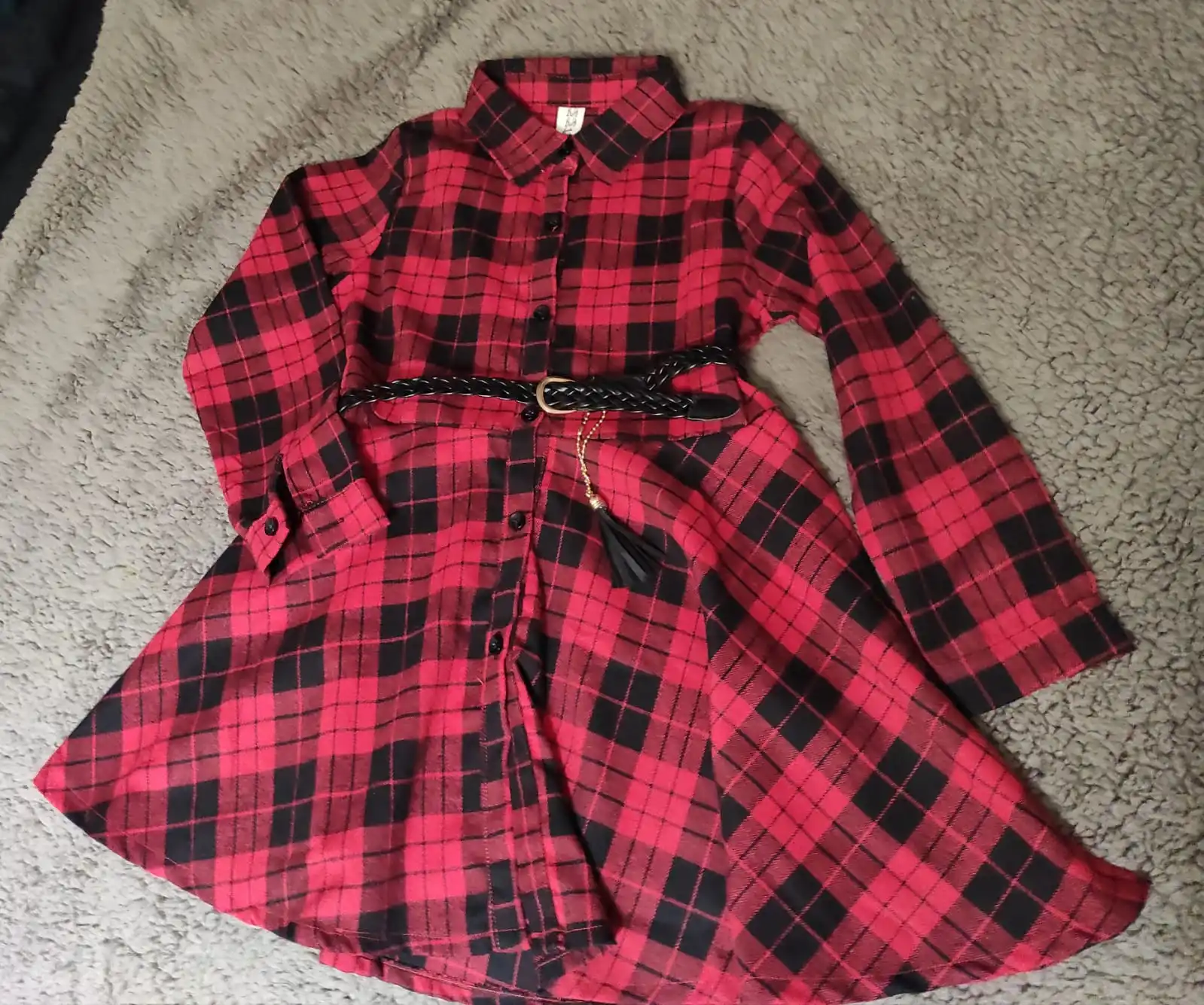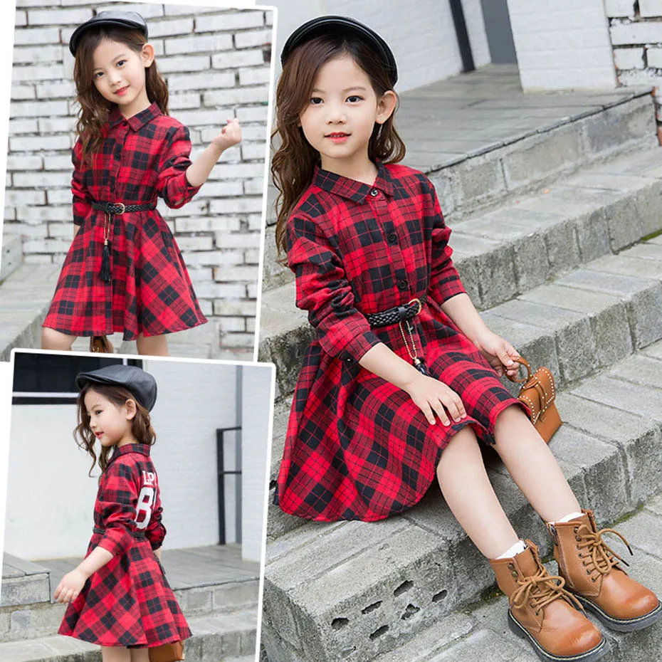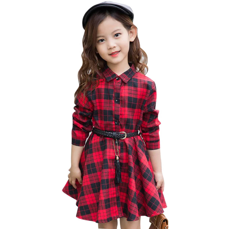 Платье-рубашка для девочек, осеннее, в клетку, однобортное вечерние поясом