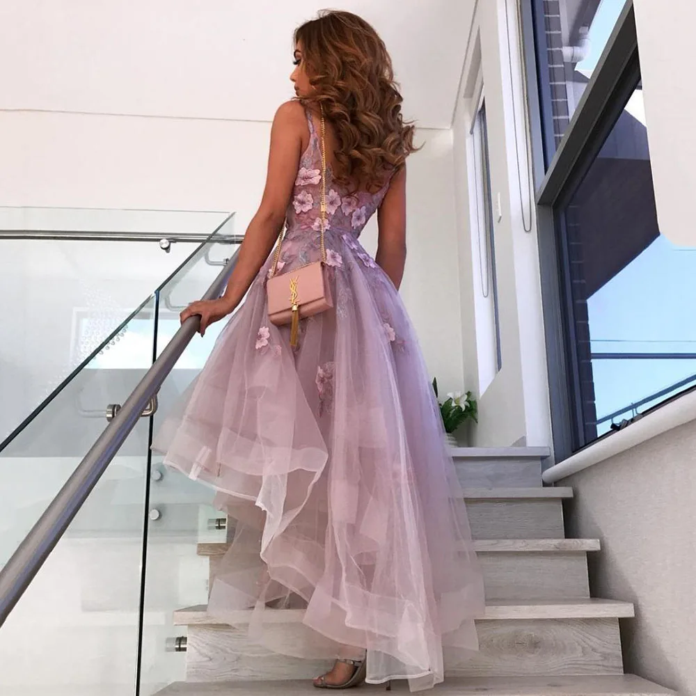 Короткое вечернее платье с V-образным вырезом, кружевом и 3d-аппликацией