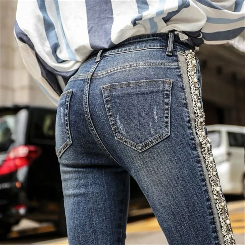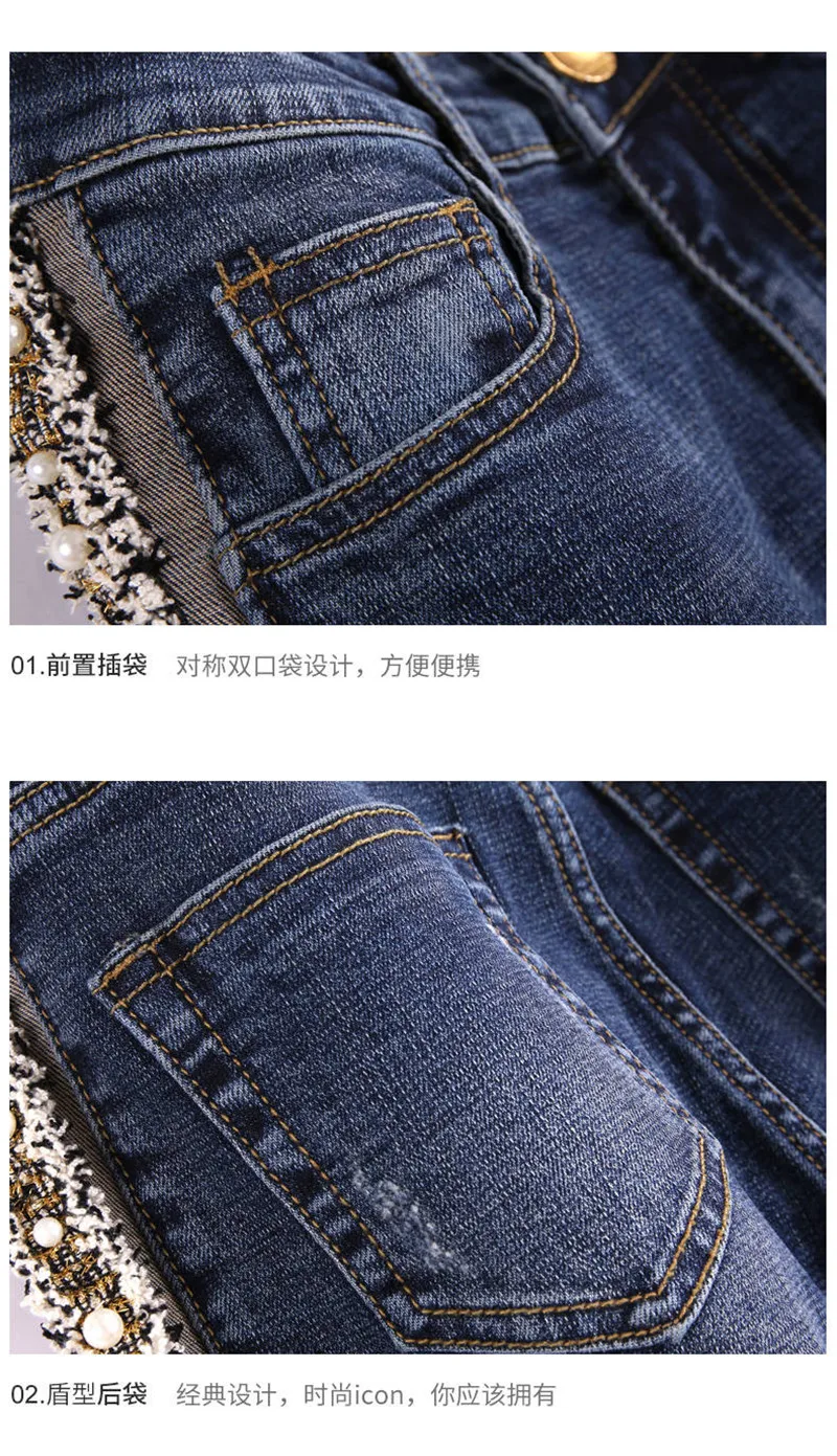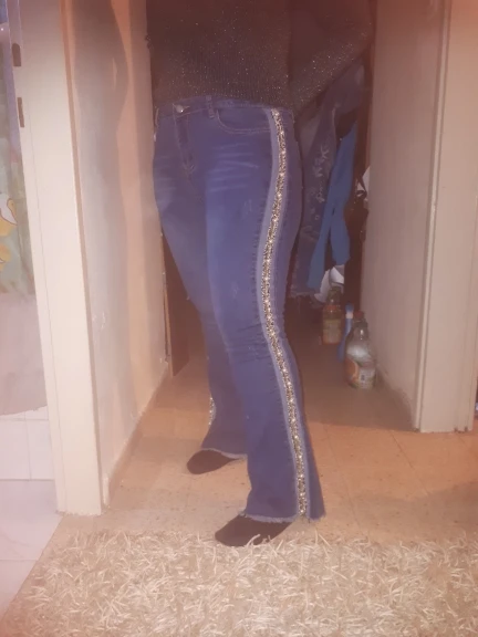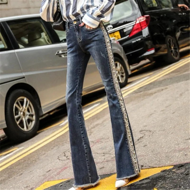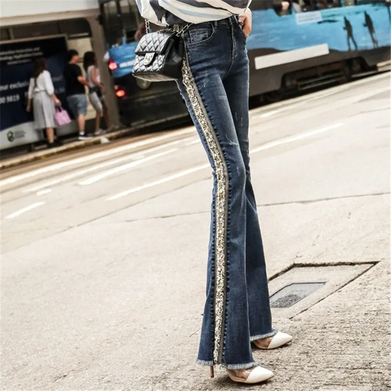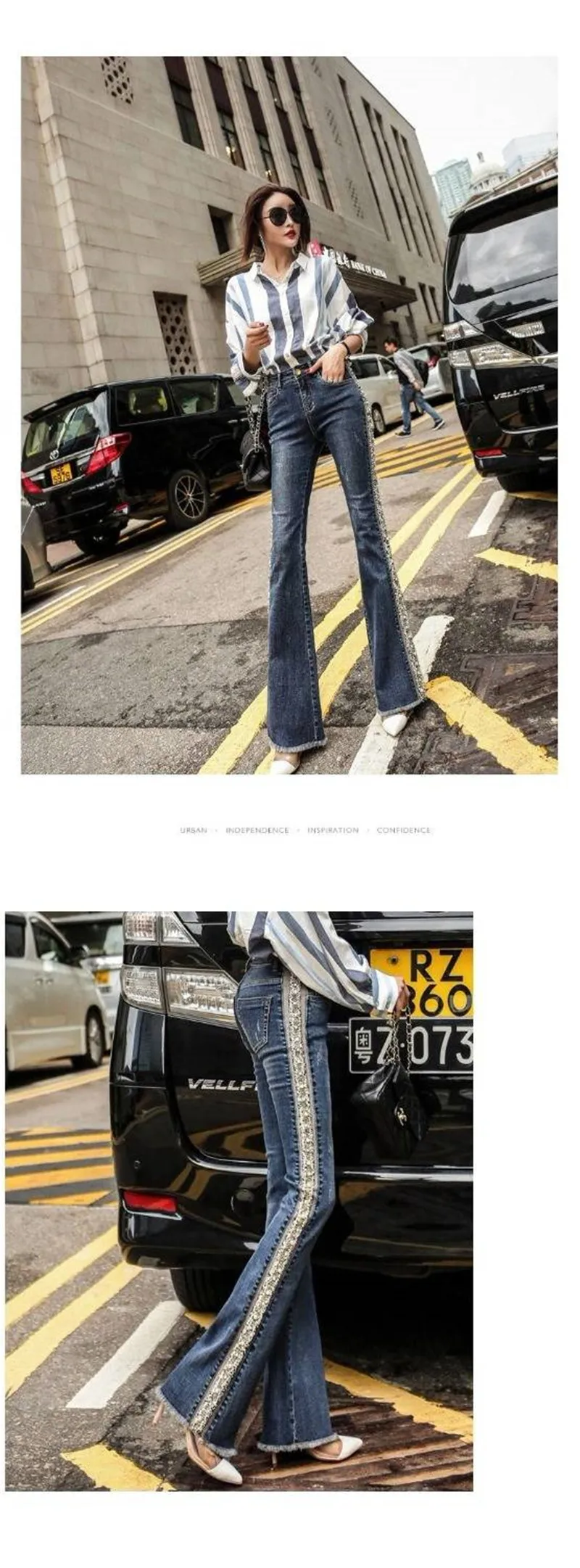 Женские джинсы-клеш с бахромой и жемчужной вышивкой
