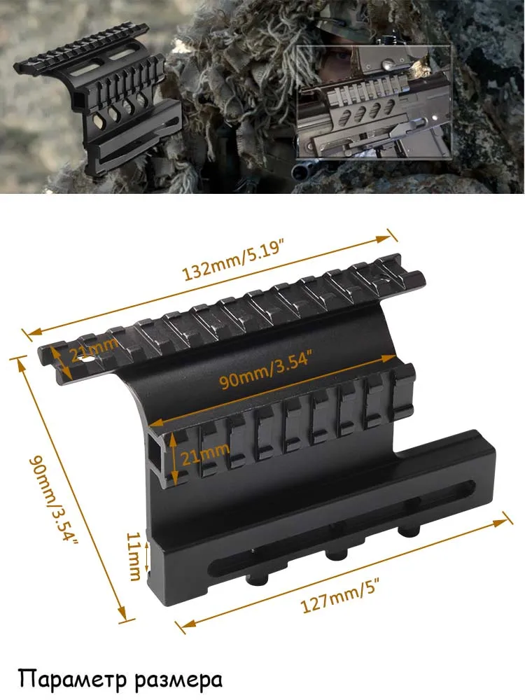 Цвет: черный;Материал: авиационный алюминий для экстремальной прочности;Вес (нетто): около 258 гРазмер: как на картинкеВерхние рельсы: 12 слотов;Боковые рельсы: 8 слотов;Позволяет установить тактический светильник или лазер, прицел для вашего страйкбола;Устанавливается на стандартную боковую рейку крепления на левой стороне приемника;Полностью регулируемый для большинства боковых рельсов AK