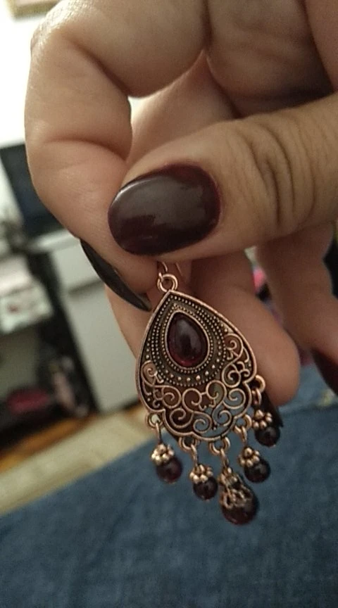 Они гораздо более яркие, чем на фото продавца. Но цвет вставок соответствует. У меня на фото он передан не верно. Они тёмные. Металл с напылением, на дужке одной серьги он даже немного отвалился. Буду покрывать лаком. Но смотрятся неплохо и если что - не жалко потерять в лесу на шабаше)