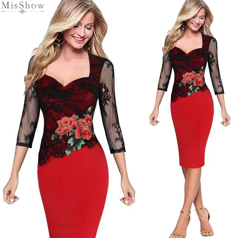 Вечернее Коктейльное Платье До Колена, с прозрачным кружевом и цветочным принтом