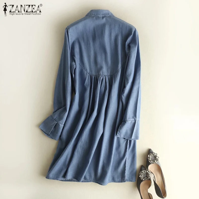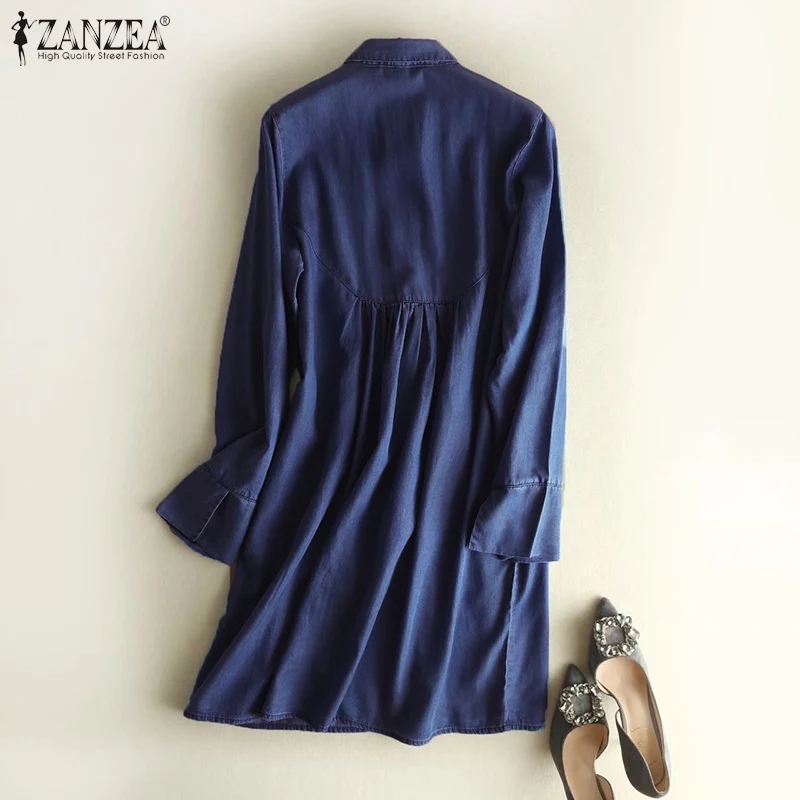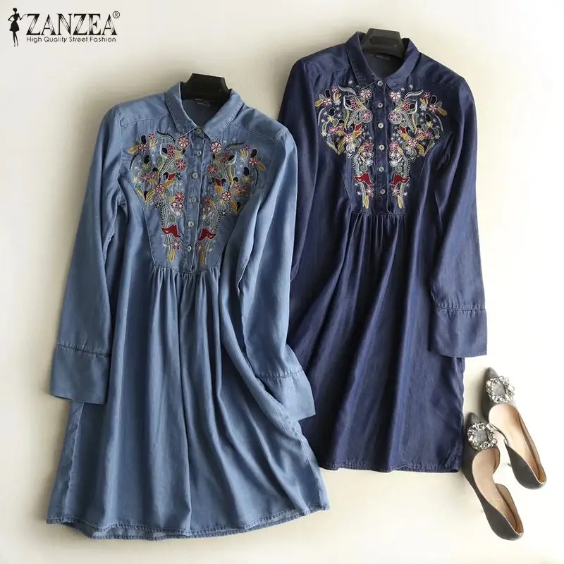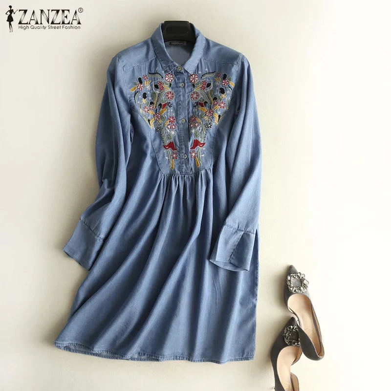 Винтажная блузка ZANZEA с цветочной вышивкой, женские длинные джинсовые рубашки с отложным воротником и длинным рукавом, свободные топы, женские блузы