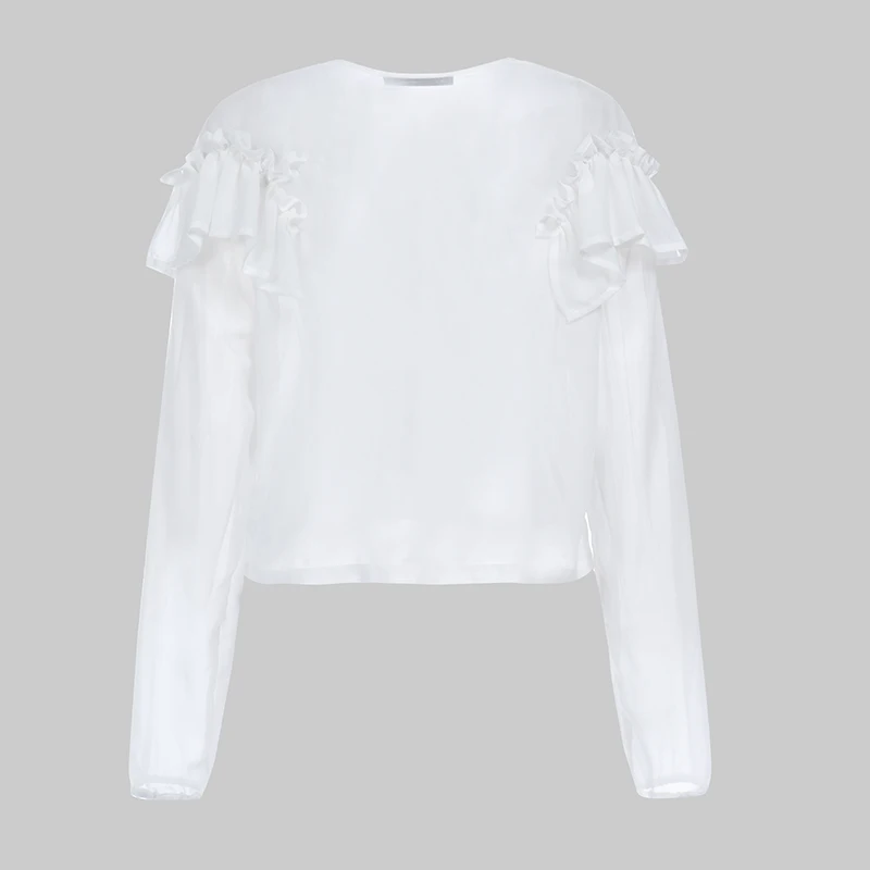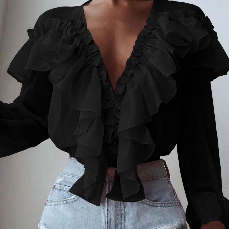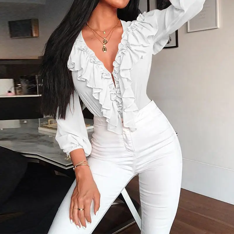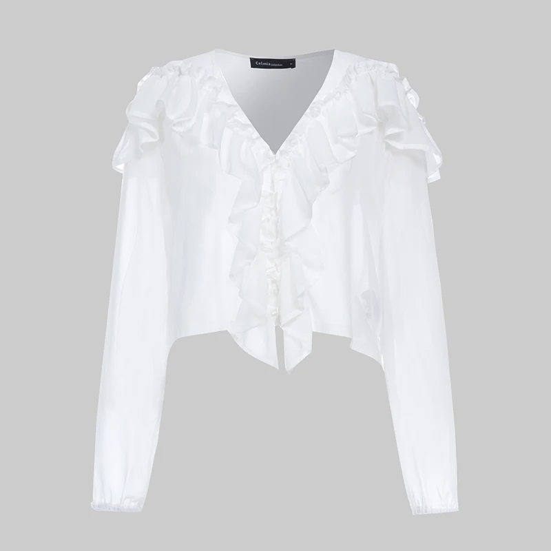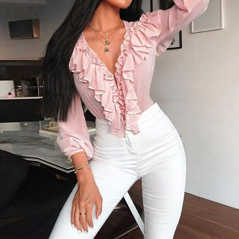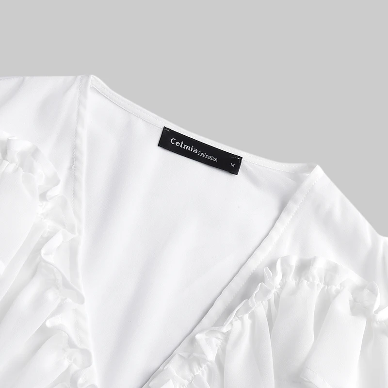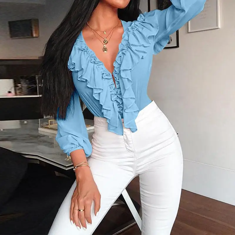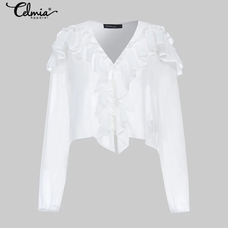 Блузка Celmia женская с оборками, модная однотонная туника с длинным рукавом, повседневный пикантный Свободный Топ с глубоким V-образным вырезом, элегантные блузки, 2021