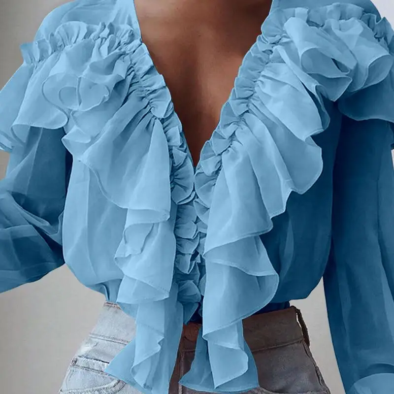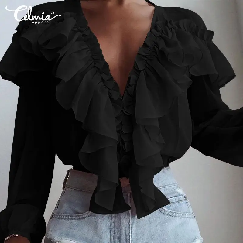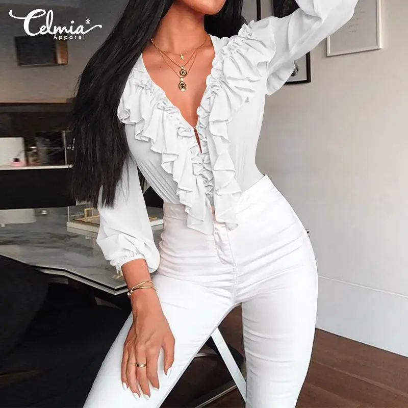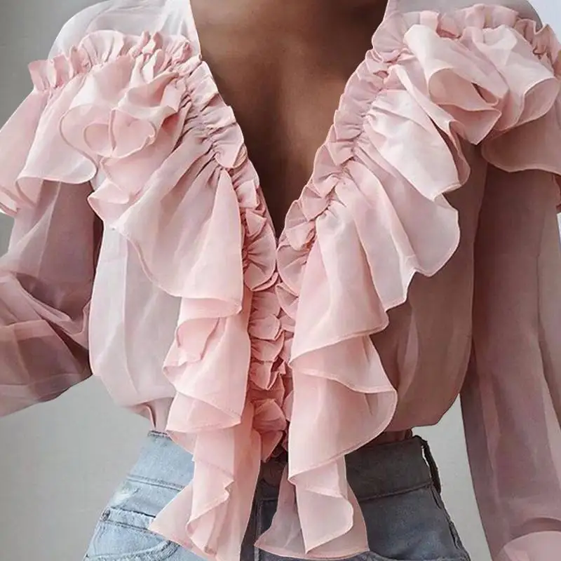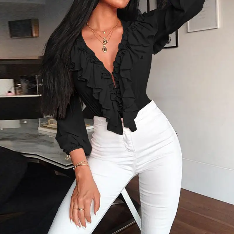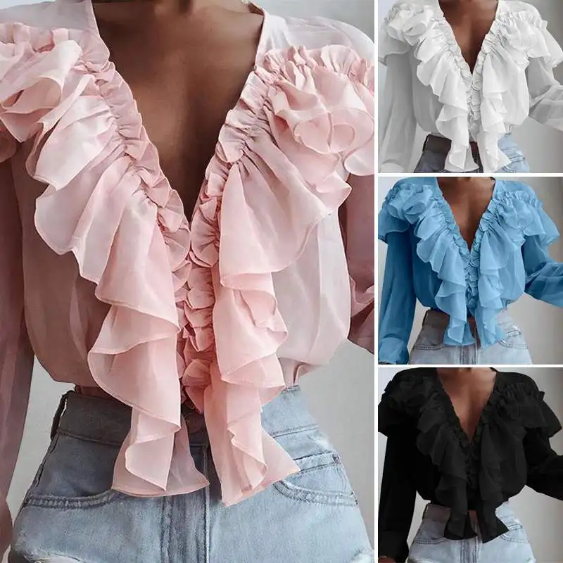 Однотонная блузка с оборками, Женская туника с длинным рукавом, топы, Повседневная Свободная рубашка, женская элегантная пикантная Тонкая блузка с глубоким V-образным вырезом, 2022