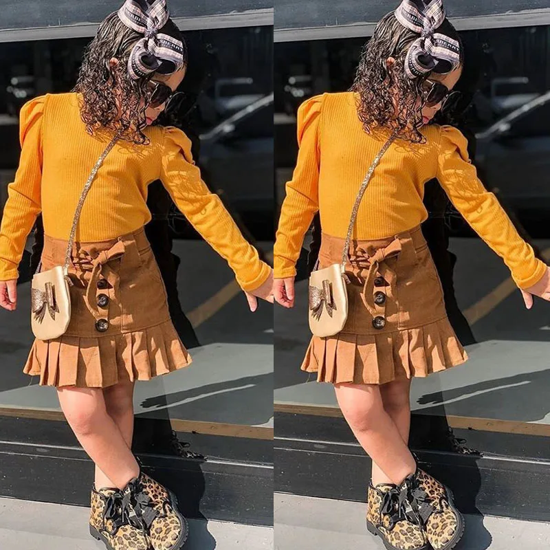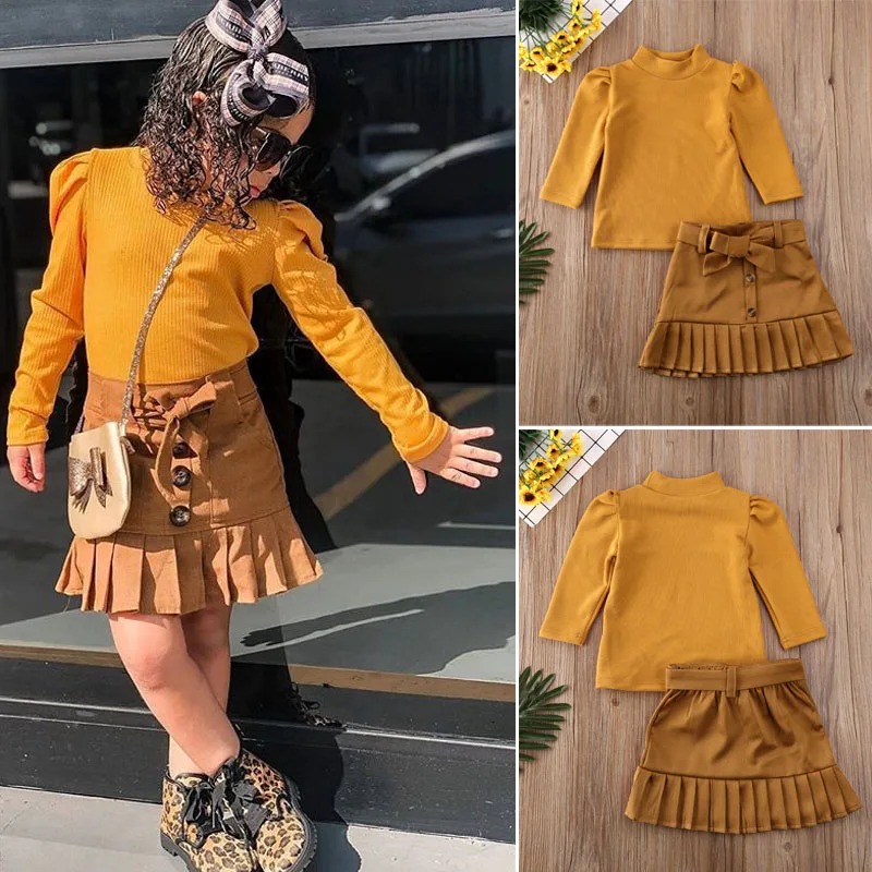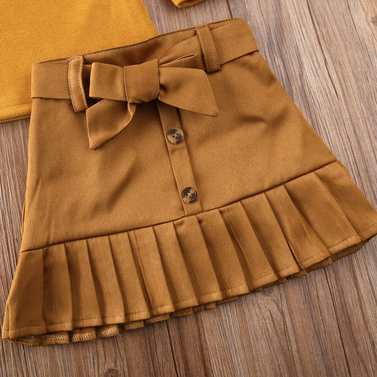 Детская демисезонная одежда для малышей, одежда для маленьких девочек, водолазка с длинным рукавом, бандажная плиссированная юбка на пуговицах, комплект из 2 предметов, 2020