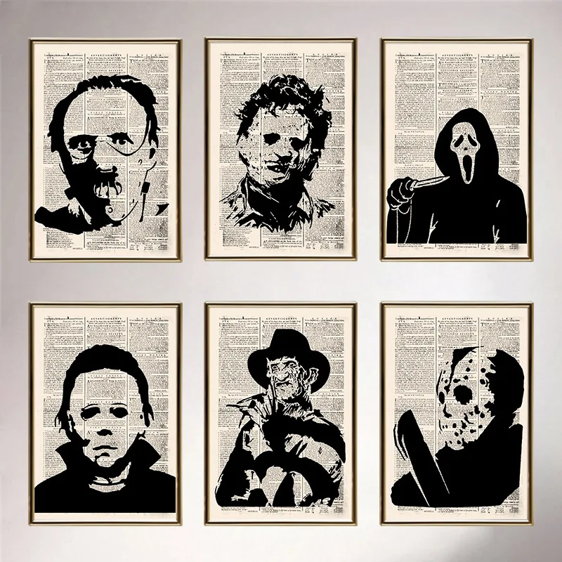 Постер с рукоятью, винтажный крафтовый стиль, ретро, старые газеты, ужасы, персонажи фильма, домашнее искусство, декоративная живопись, картина маслом