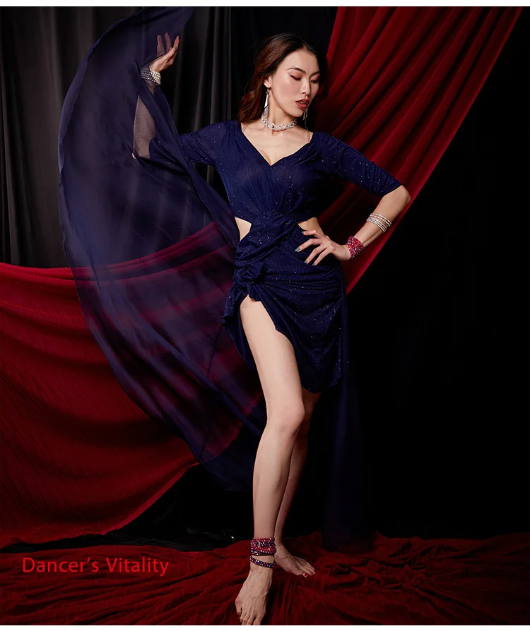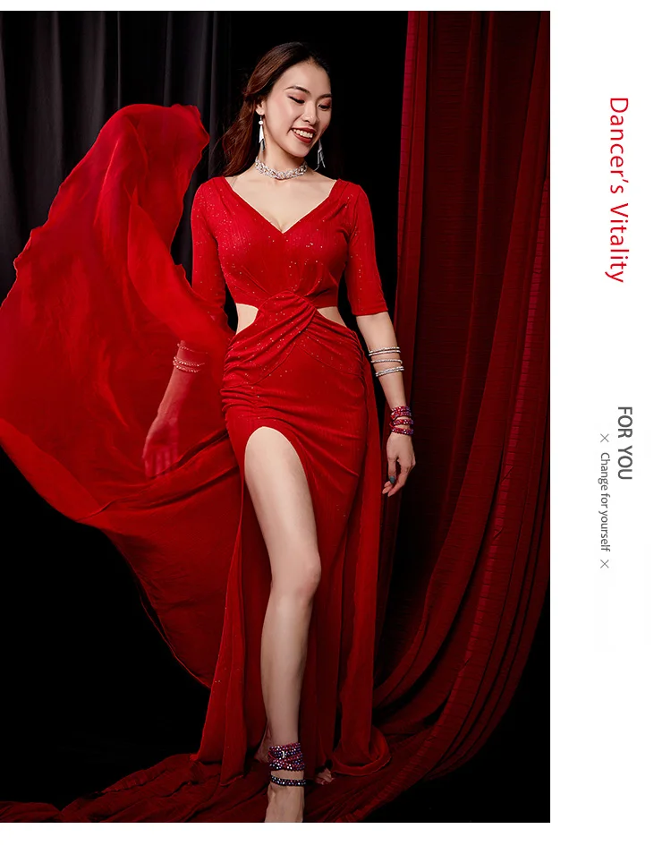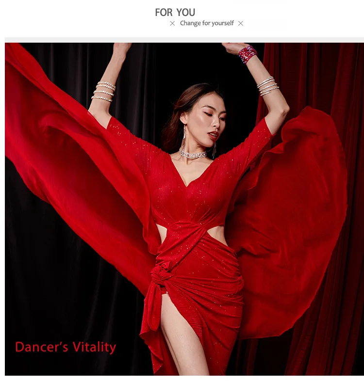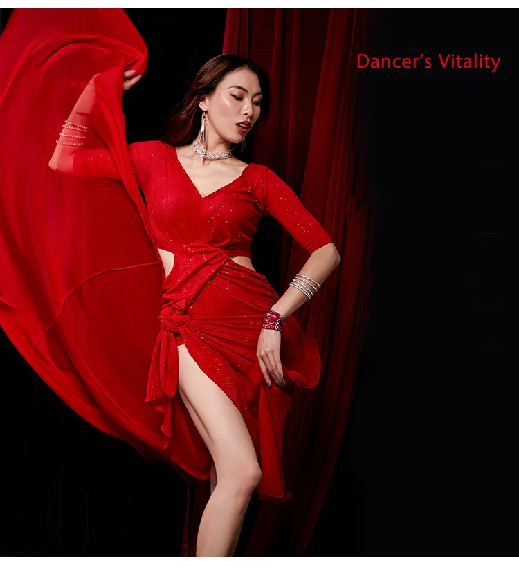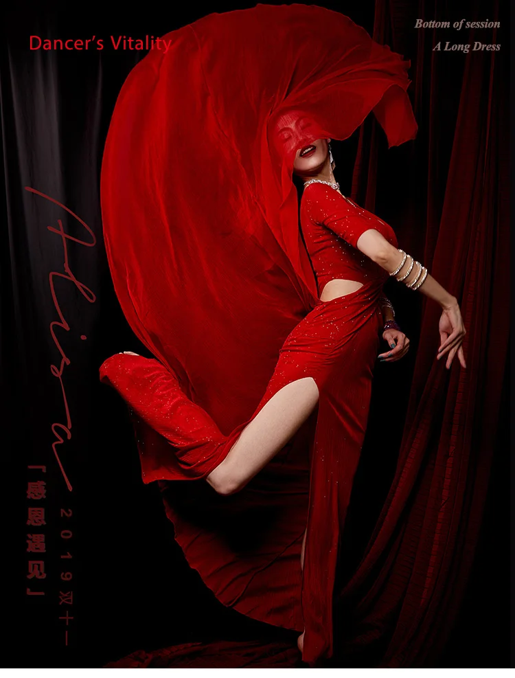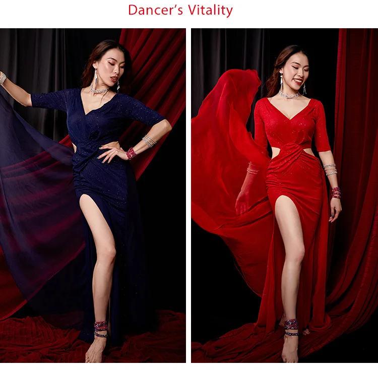 Юбка для танцев, платье с длинными рукавами, Женский костюм из спандекса, синий и красный цвета