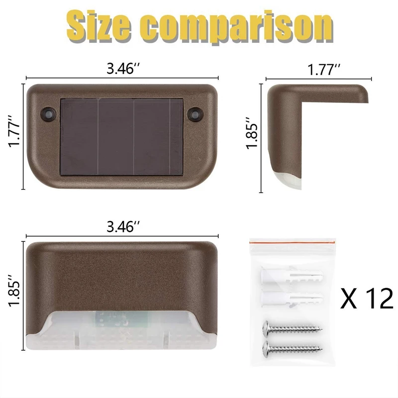 Набор из 12 солнечных ступенчатых светильник s: каждый солнечный светильник с 3 люменами, бронзовая отделка, теплый белый светодиод, упаковка из 12 достаточно для освещения вашего двора или сада.Идеальный внешний декор: Этот набор из 12 наружных солнечных ступенчатых огней идеально подходит для украшения наружных лестниц, заборов, доков, колод и почтовых ящиков.Солнечная энергия ed: поскольку полностью Солнечная энергия ed, требуются нулевые счета за электроэнергию и электропроводка. Просто установите его в области, где он получит много солнечного света. Он также включается автоматически в сумерках и выключается на рассвете.Простота установки: поставляется с двумя вариантами крепления, либо поместите его вертикально, либо положите его на плоскую поверхность. Используйте винты, включенные в свет.Водонепроницаемый: предназначен для выдерживания дождя, ветра, снега, льда-вы называете его. Не стесняйтесь обращаться к нам, если у вас есть какие-либо вопросы.Мощность: 0,12 ВтЯркость светильника: 3 люменСветильник; Цвет: теплый белыйВремя зарядки: 4-5 часовРазмер каждого светильника: 3,46x1,77x1,85 дюймаДругие особенности: защита от атмосферных воздействийЦвет: коричневыйМатериал: АБС-пластикПосылка:12 лестничных огней1 х Набор крепежных винтовТолько вышеуказанная посылка, другие товары не включены.Примечание: светильник и различные дисплеи могут привести к тому, что цвет товара на картинке немного отличается от реального. Допускается погрешность в измерениях +/- 1-3 см.