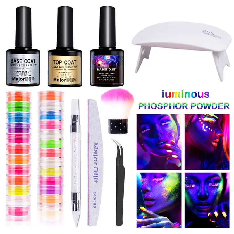 10 шт.компл. голографический фосфорный светящийся порошок для ногтей, набор инструментов для маникюра с блестками, светящимися в темноте
