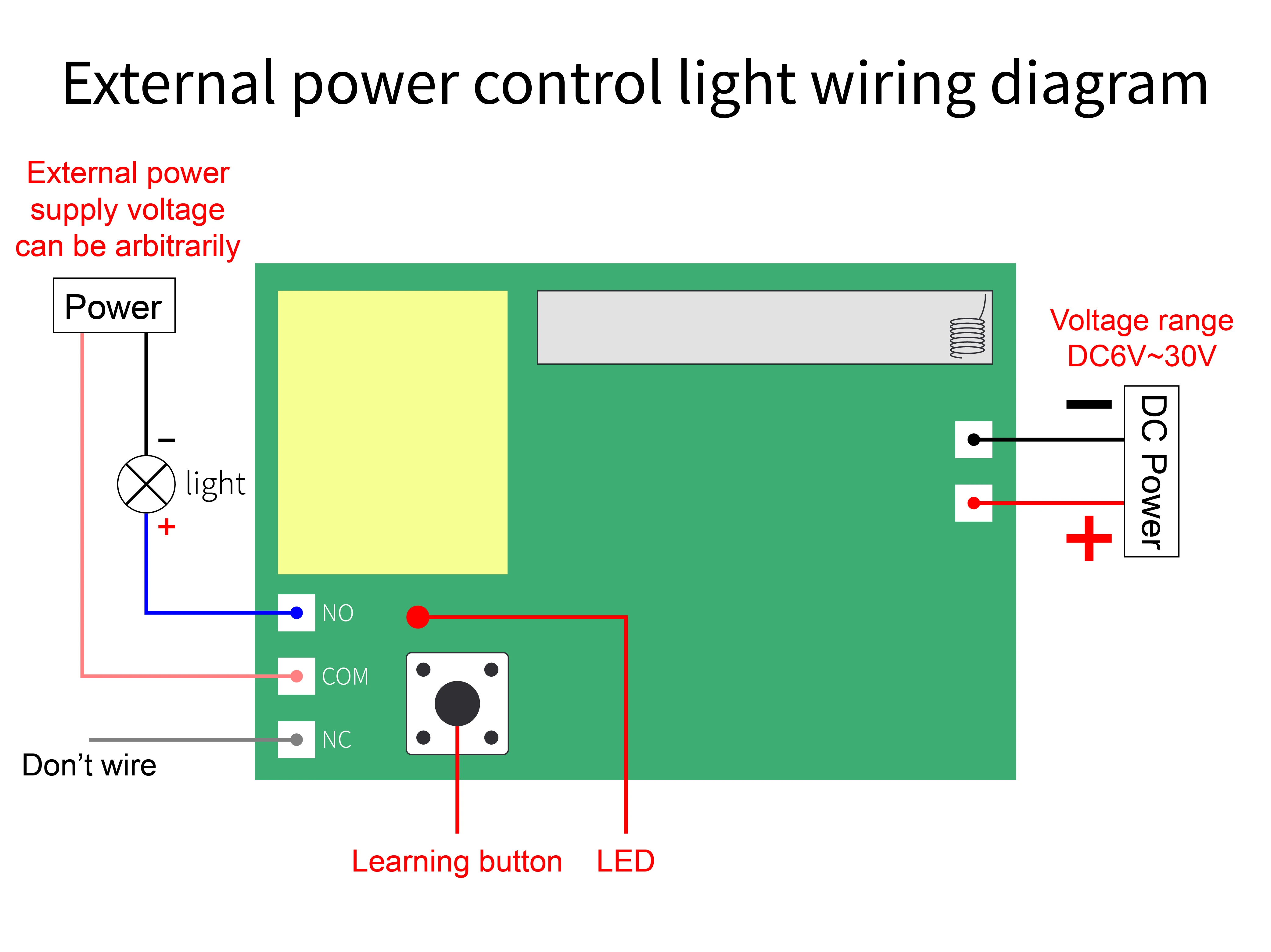 О режиме работы:Изучение кода (мгновенный):Нажмите кнопку обучения на приемнике один раз, инициируйте мгновенный режим настройки.Просто подождите, пока светодиодный индикатор выключится.Нажмите кнопку дистанционного управления, светодиодный индикатор на плате приемника будет мигать ненадолго и выключаться.Через 3 секунды светодиодный индикатор снова включится, показывает, что пульт ДУ и приемник успешно соединены.Изучение кода (переключение):Нажмите клавишу обучения на приемнике дважды, инициализирует режим переключения.Через несколько секунд светодиодный индикатор выключится.Нажмите кнопку дистанционного управления, светодиодный индикатор на плате приемника будет мигать ненадолго и выключаться.Через 3 секунды светодиодный индикатор снова включится, показывает, что пульт ДУ и приемник успешно соединены.Изучение кода (фиксация):Примечание: режим фиксации требует двух разных кнопок, первый для включения, второй для выключения.Например: Кнопка A = ON, кнопка B = OFF.Нажмите клавишу обучения на приемнике 3 раза, инициируйте настройку режима блокировки.Через несколько секунд светодиодный индикатор на приемнике будет мигать ненадолго и выключаться.Нажмите кнопку дистанционного управления A, светодиодный индикатор мигает 5 раз.Нажмите кнопку дистанционного управления B, светодиодный индикатор мигает 5 раз.3 секунды спустя светодиодный индикатор снова включится, показывает, что пульт ДУ и приемник успешно соединены.A = ON , B = OFF.Очистка кода:Нажмите кнопку обучения на приемниках в течение 8 раз, коды будут стерты. После очистки кода, все пульты дистанционного управления должны быть отремонтированы, чтобы снова управлять приемником.Примечания:1. Пожалуйста, не заряжайте работу, вы должны выключить питание и работать после тестирования и коррекции электричества.2. Пожалуйста, немедленно измените батарею, когда напряжение пульта дистанционного управления недостаточное (когда напряжение батареи недостаточное, как правило, приближается передача).3. Пожалуйста, обратите внимание, чтобы избежать металлической маски, большого оборудования, сильных помех, электромагнитных поданных при использовании беспроводных радиочастотных продуктов, и избежать слишком короткого расстояния между пультом дистанционного управления и приемной платой.4. Пожалуйста, избегайте ненормального использования продукта. Ненормальное использование уменьшит производительность продукта и срок службы, если серьезно это может повредить продукты и даже сделать опасность для вашего сейфа.