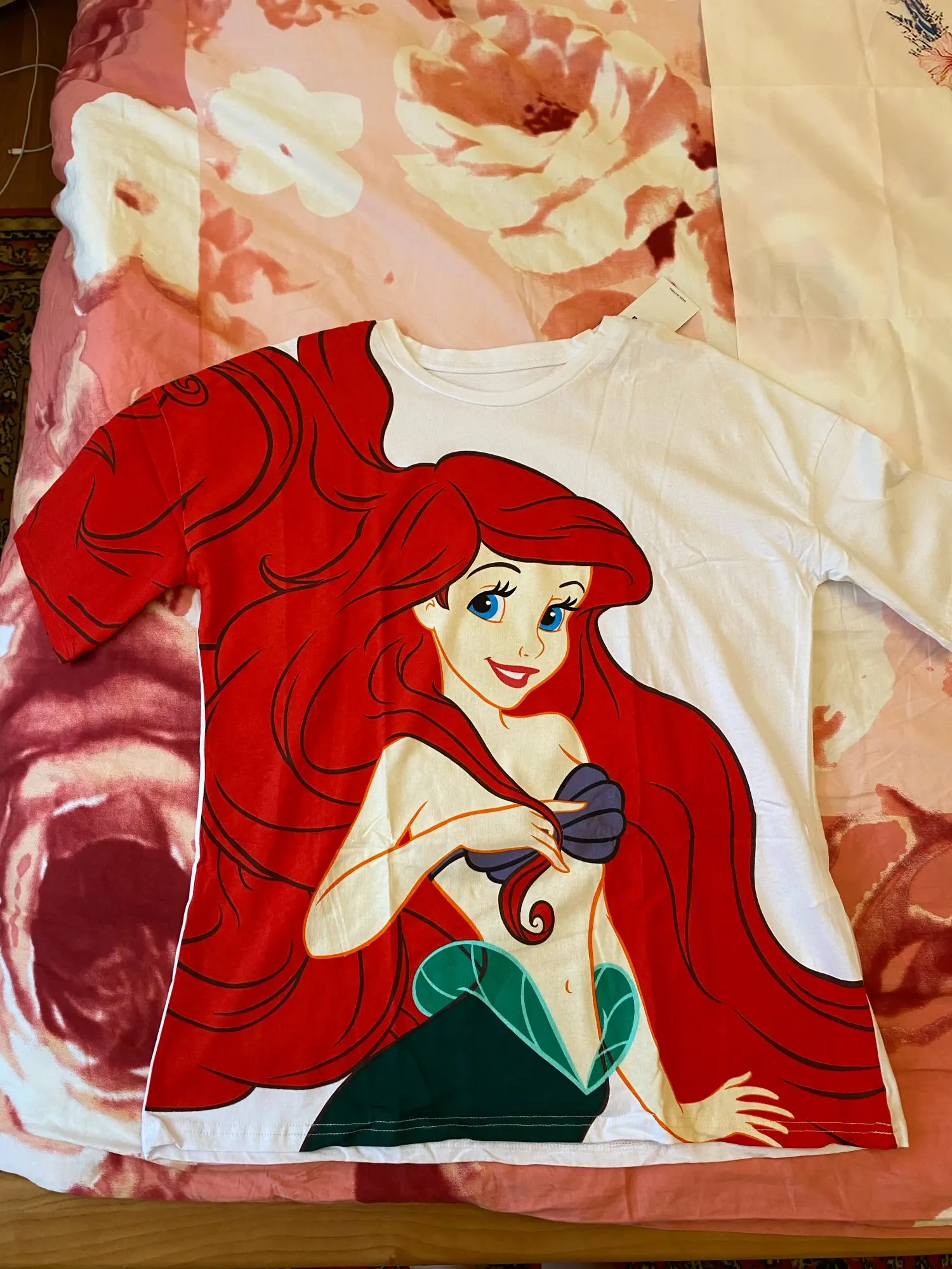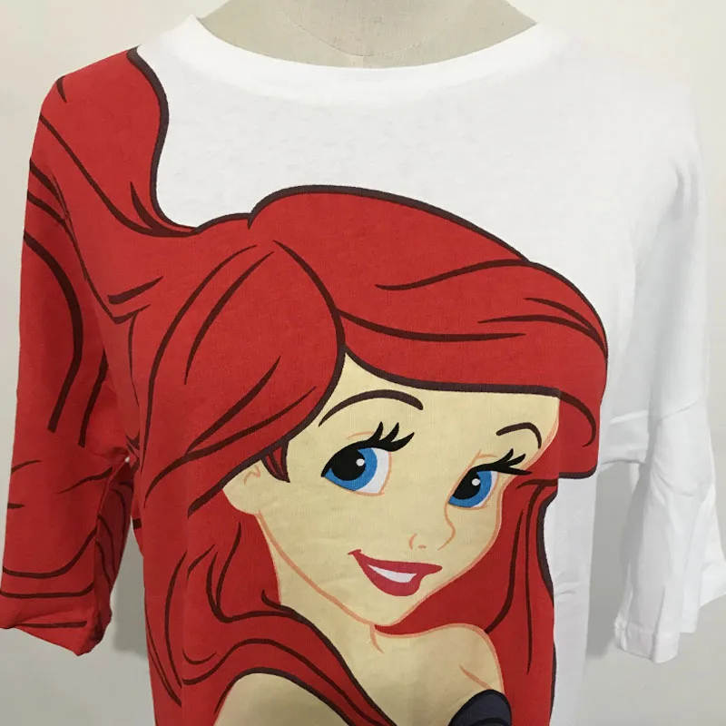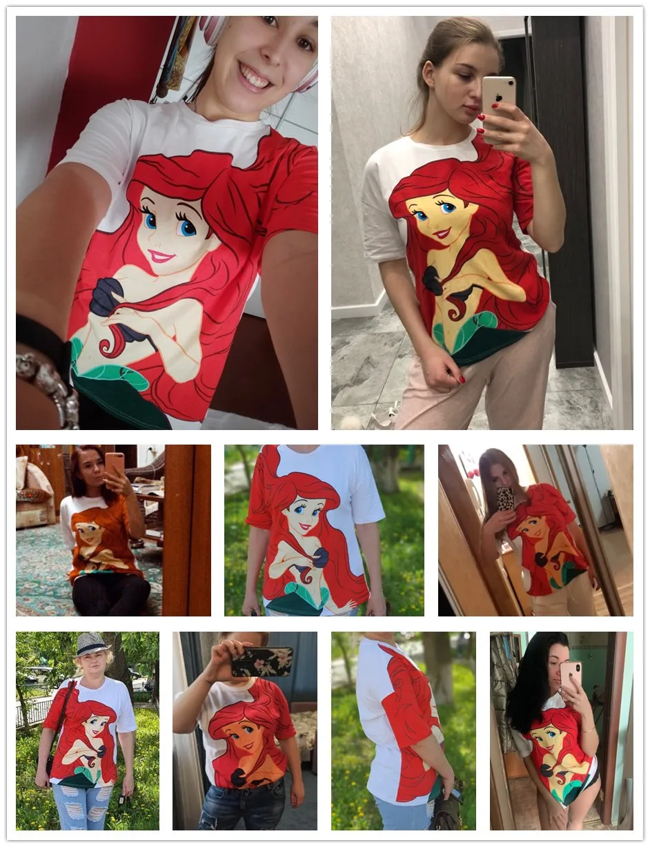 Белая футболка с большим мультяшным принтом Ариэль, Русалочка Диснея, пуловер с круглым вырезом, повседневные милые женские футболки с коротким рукавом, топы