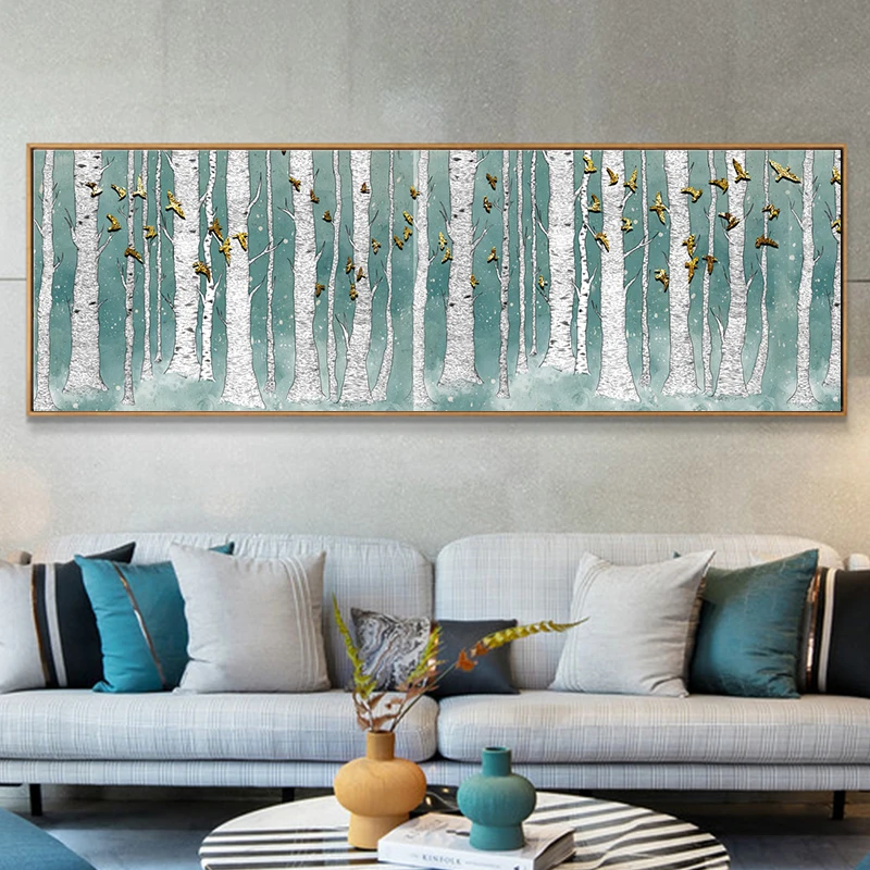 Бирюзовые плакаты и принты, настенная Картина на холсте, абстрактные Золотые деревья, птицы, настенные картины для гостиной, Декор