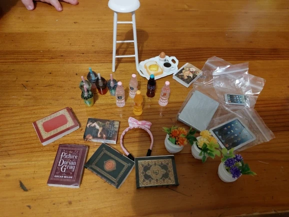 Все товары мне понравились. Все очень маленькое и точное. В один момент я хочу отметить, что барный стул слишком мал для куклы Барби, чтобы быть стулом. Я думаю, это будет служить полкой. Ноутбук не может оставаться открытым. (Каждый раз закрывается. Но телефон и планшет такие подробные.