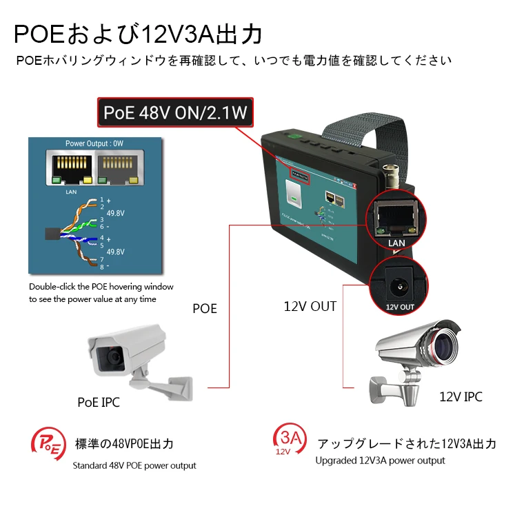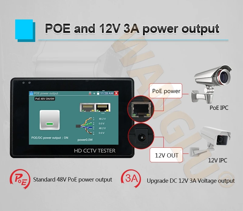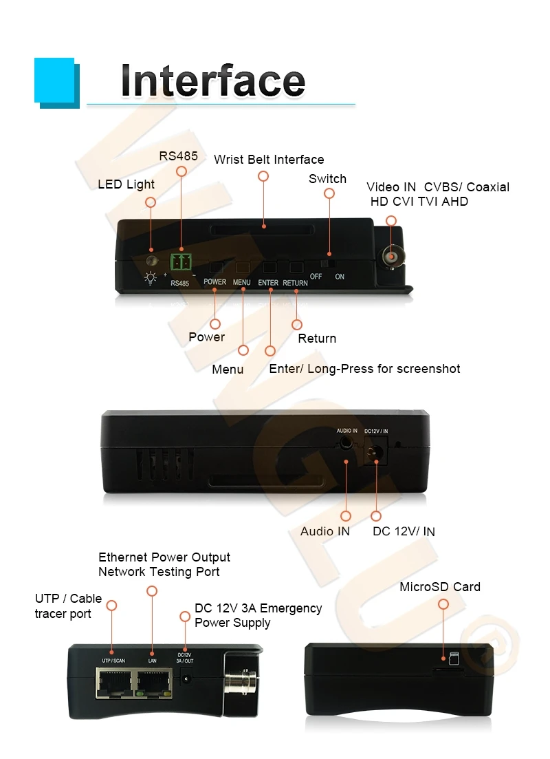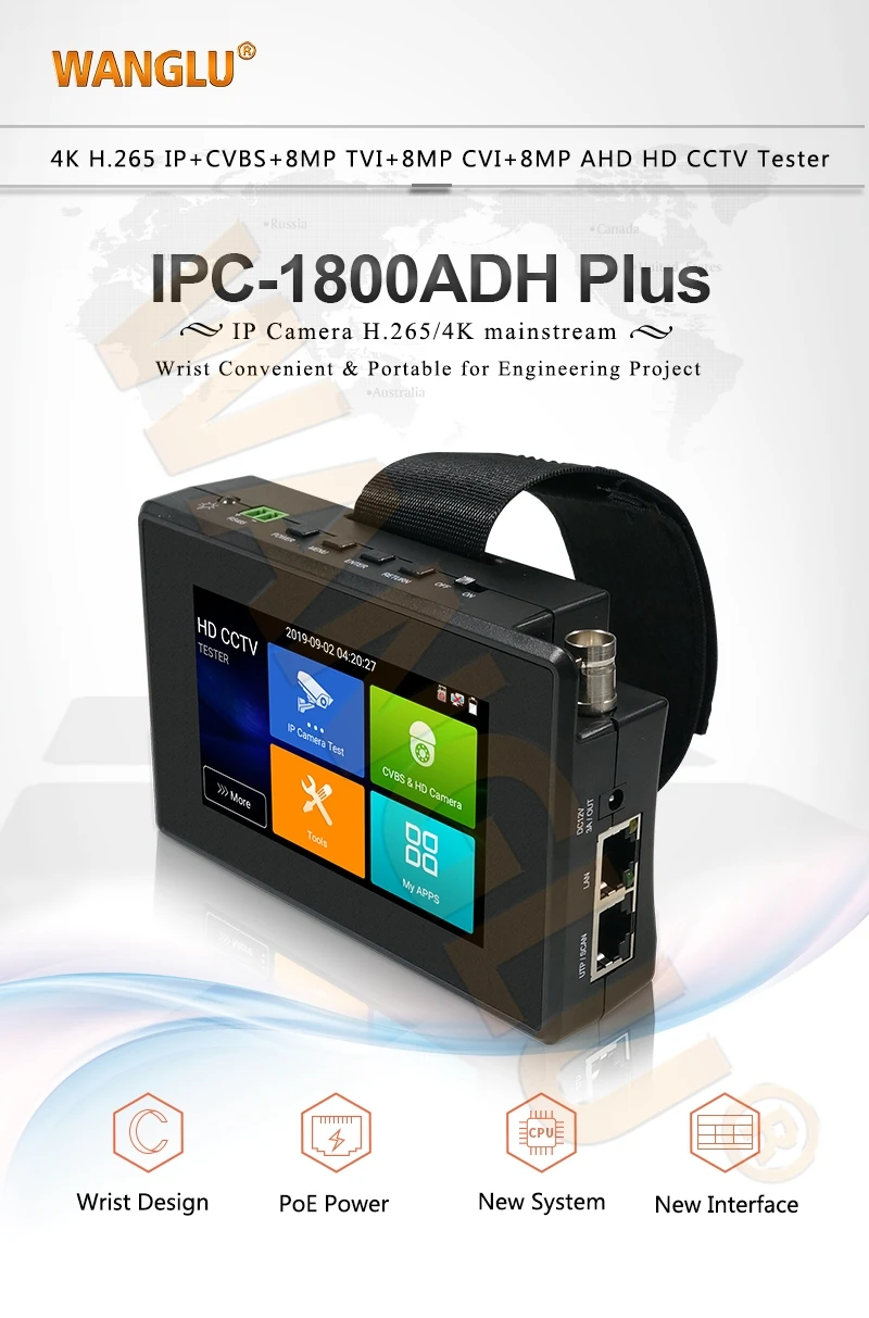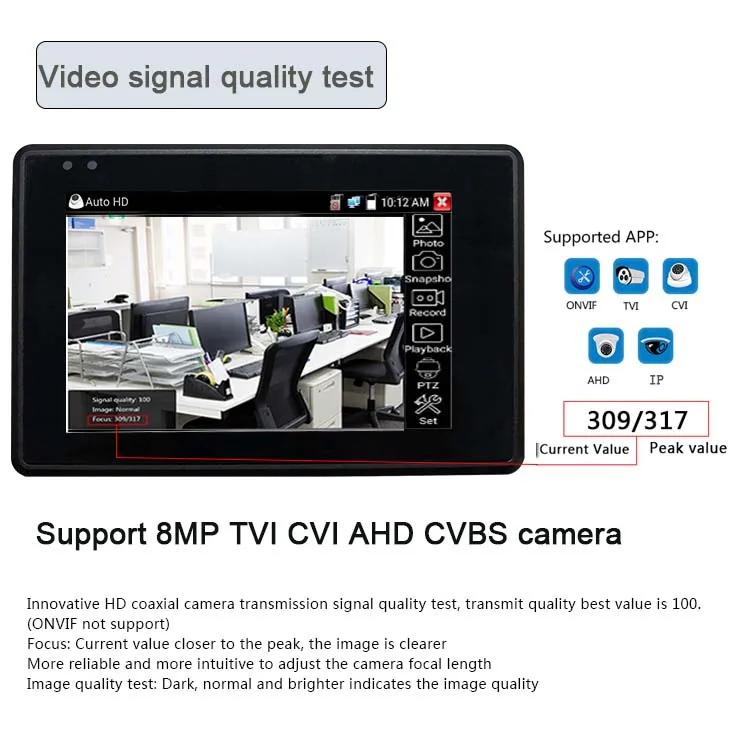 4 дюйма IPS сенсорный экран ip-камера тестер предназначен для обслуживания и установки IP аналоговый видеорегистратор, HD коаксиальный камеры, а также другое оборудование для безопасности. Разрешение 800*480 позволяет ему отображать сетевые HD камеры и аналоговые камеры в высоком разрешении. Устройство поддерживает множество ONVIF PTZ и аналоговый PTZ контроль. Для завершения работы установщикам системы видеонаблюдения часто необходимо использовать различные инструменты тестирования. Если взять все в одном тестере камеры, делая условия работы более безопасными и увеличивая производительность.
