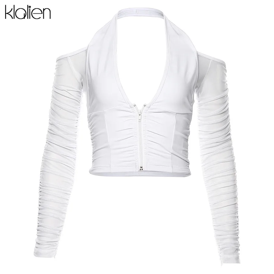Женская сетчатая рубашка KLALIEN, укороченный топ с V-образным вырезом и длинным рукавом, без бретелек, для клуба и вечеринки, 2020