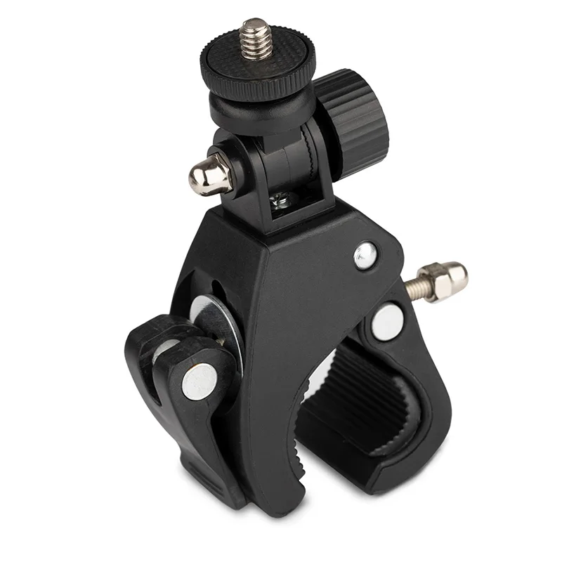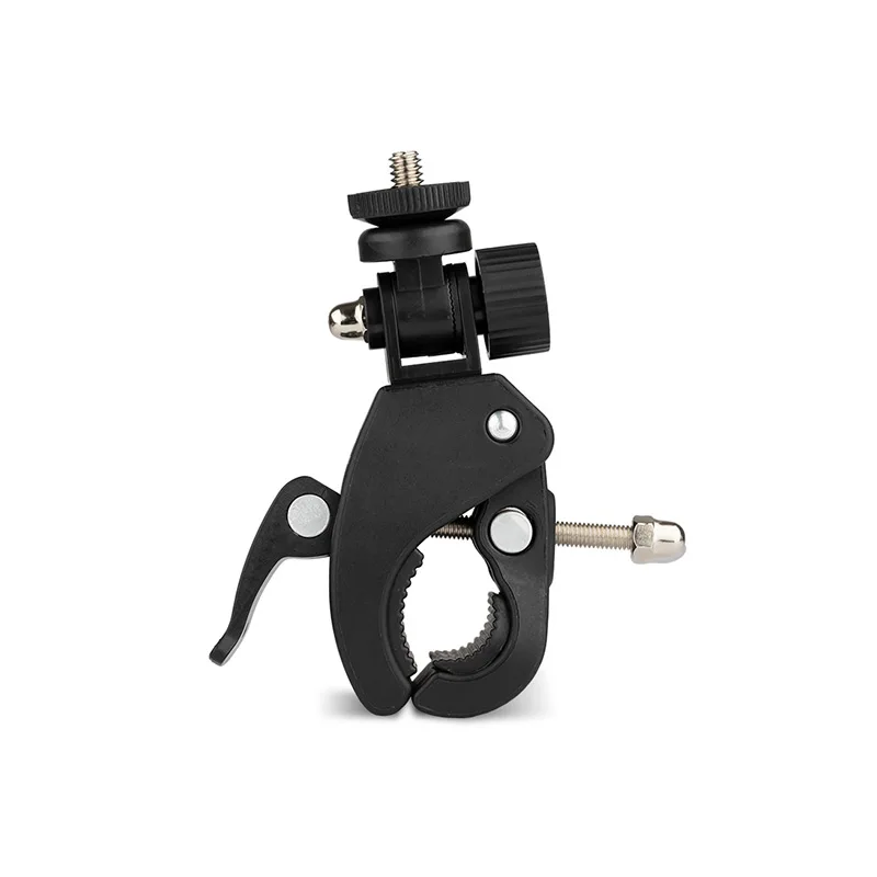 Зажим для камеры устанавливается на руль велосипеда/мотоцикла/скутера, а видеорегистратор/Цифровая камера/видеорегистратор можно прикручивать к зажиму через собственное крепежное отверстие.