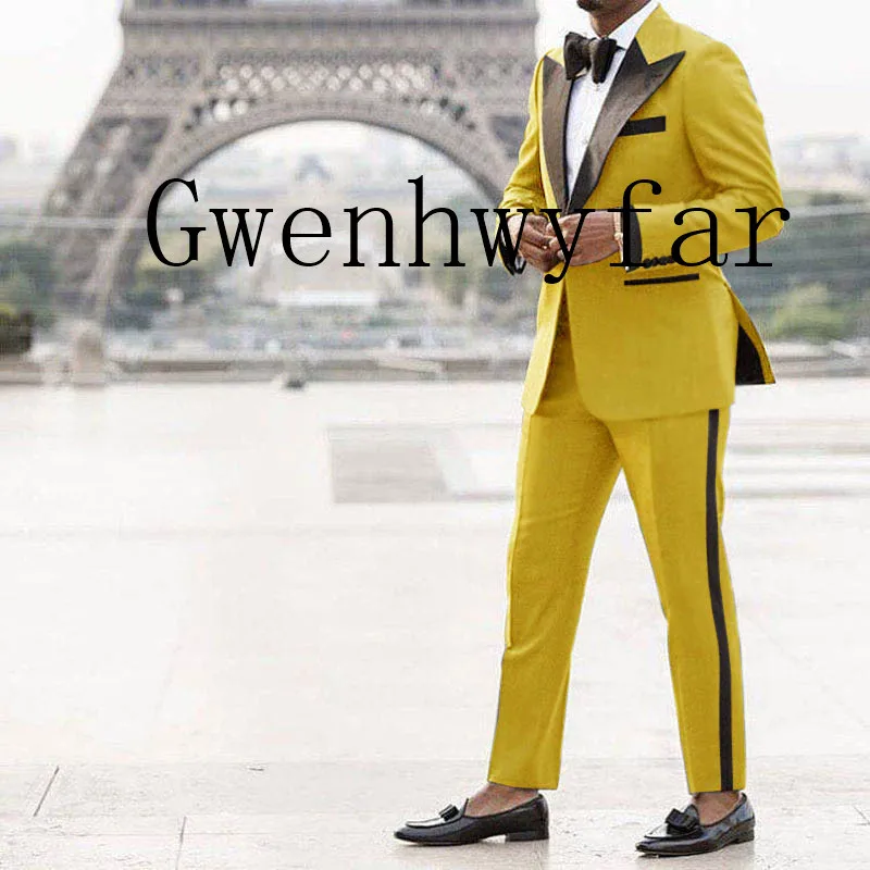 Новейший дизайн 2020, мужские костюмы с заостренным лацканом на одной пуговице, мужские желтые смокинги под заказ, крутой Блейзер, мужской красивый тонкий пиджак + брюки