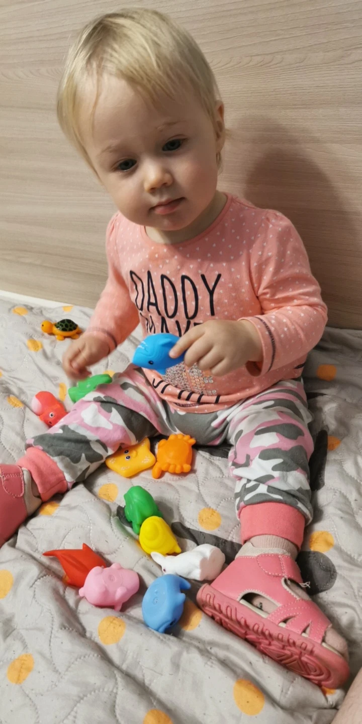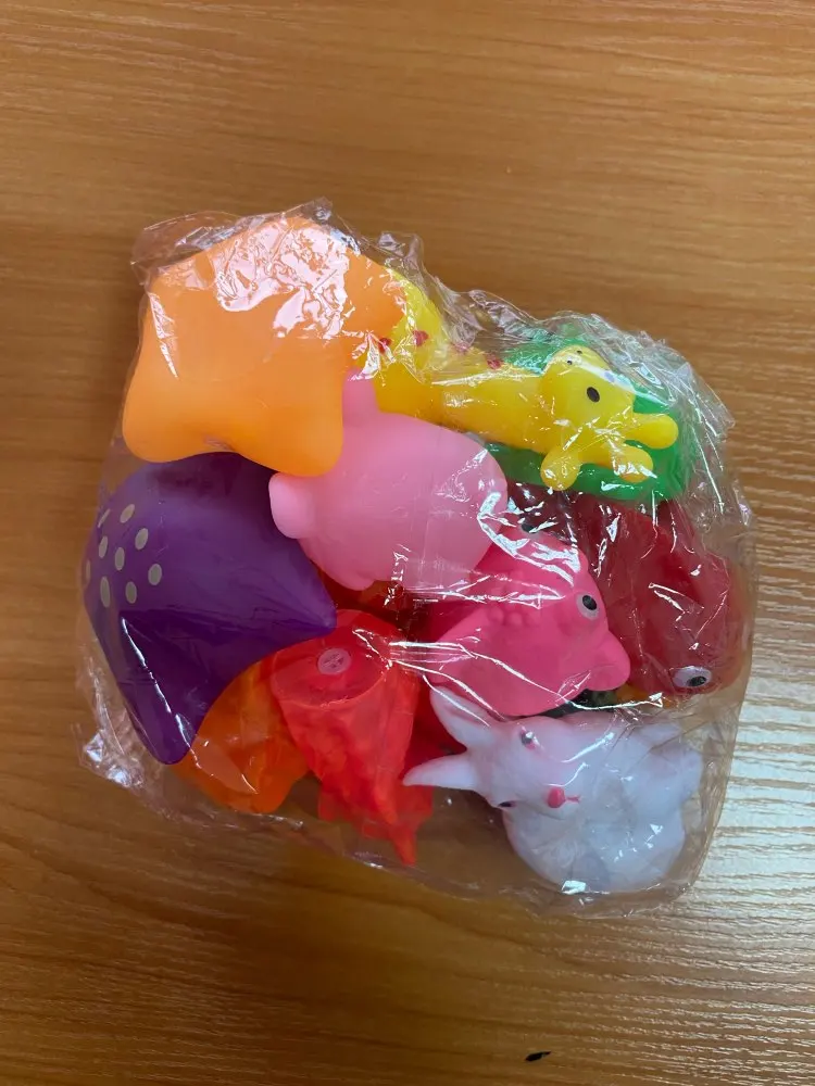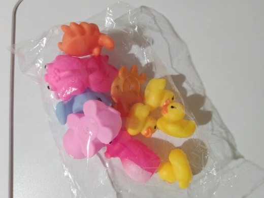 Хорошие силиконовые маленькие игрушки для ванны. В нашем случае для бассейна. Псчалку можно вытащить если мешает. Есть небольшой резиновый запах из мешка. Мне кажется не критично.
