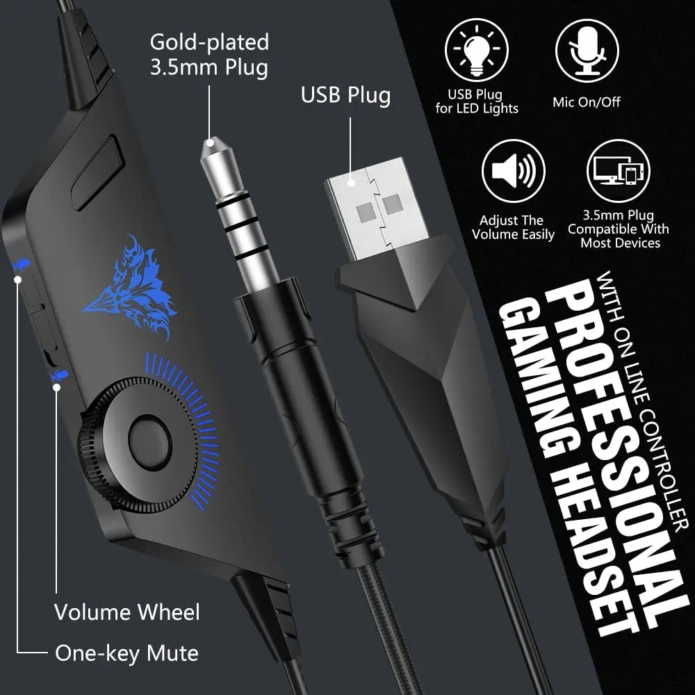 【Широкое Применение: Поддержка PlayStation 4, Xbox One S, ПК, Nintendo 3DS, ноутбуков, PSP, PS2, планшетов, iMac, компьютеров, мобильный телефон. Обратите внимание, что вам нужен дополнительный адаптер Microsoft (не входит в комплект) при подключении к старой версии контроллера Xbox One【Окружающие стерео сабвуферы 】 чистый звук, работающий из сильной латуни, великолепная изоляция окружающего шума и высокая точность 40 мм магнитный неодимовый драйвер, точность акустического позиционирования повышает чувствительность акустического блока, принося вам яркое звуковое поле, четкость звука, ударный звук. Идеально подходит для различных игр, таких как Halo 5 Guardians, Metal Gear Solid, Call of Duty, Star Wars Battlefront, Overwatch, World of Warcraft Legion и т. д.【 Шумоизоляция микрофона 】встроенный микрофон onmi-directional может передавать высококачественную связь с высококачественной функцией шумоподавления, может улавливать звуки с большой чувствительностью и удалять шум, что позволяет вам четко доставлять или получать сообщения во время игры. Длинный Гибкий микрофон очень удобно регулировать угол наклона микрофона.[Большой гуманизированный дизайн] Превосходное удобство и хорошая воздухопроницаемость белок накладные амбушюры, Мути-точки головного света, acord с инженерной спецификацией человеческого тела может уменьшить Ухудшение слуха и нагрев пота. Кожаный материал для более длительного ношения. Яркий светодиодный светильник desigend на наушниках, чтобы подчеркнуть атмосферу игры.【Легко Регулировка громкости 】высокая прочность на растяжение, usb-кабель с оплеткой от обмотки с поворотным регулятором громкости и микрофоном для ключей эффективно предотвращает скручивание кабеля длиной 49 дюймов и позволяет легко контролировать громкость и отключать микрофон в качестве легкого объема управляйте одним ключом без звука.