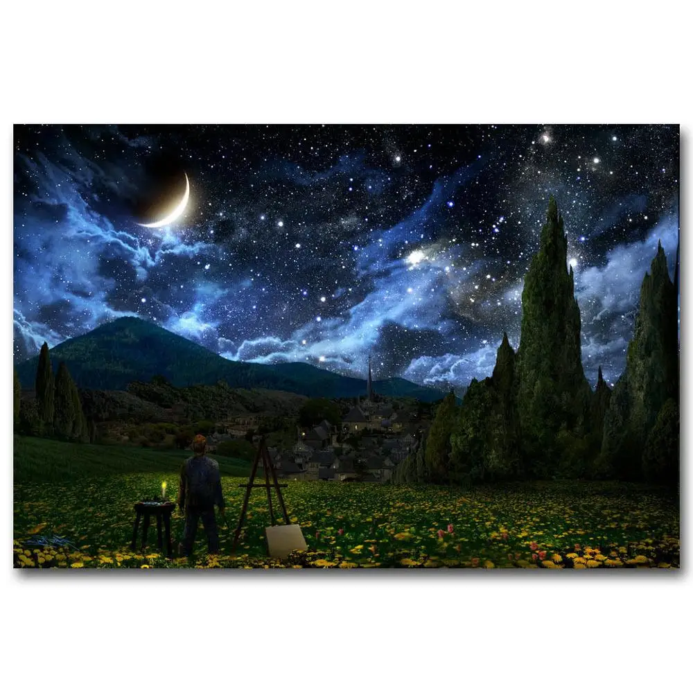 Картина Ван Гога, Звездный Ночной пейзаж, шелковая ткань, яркая декоративная наклейка