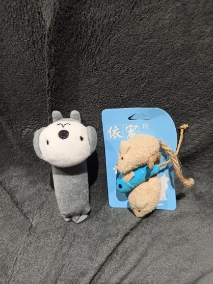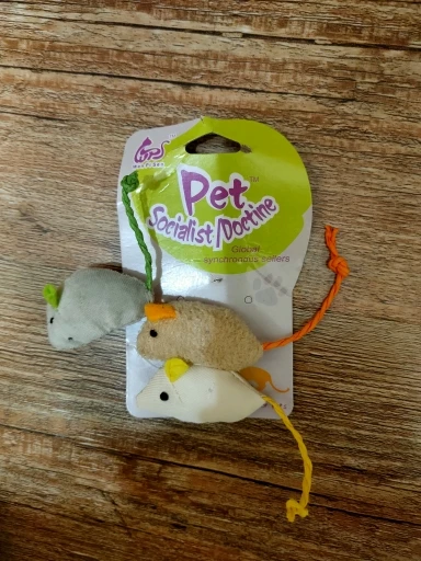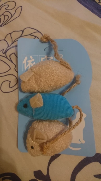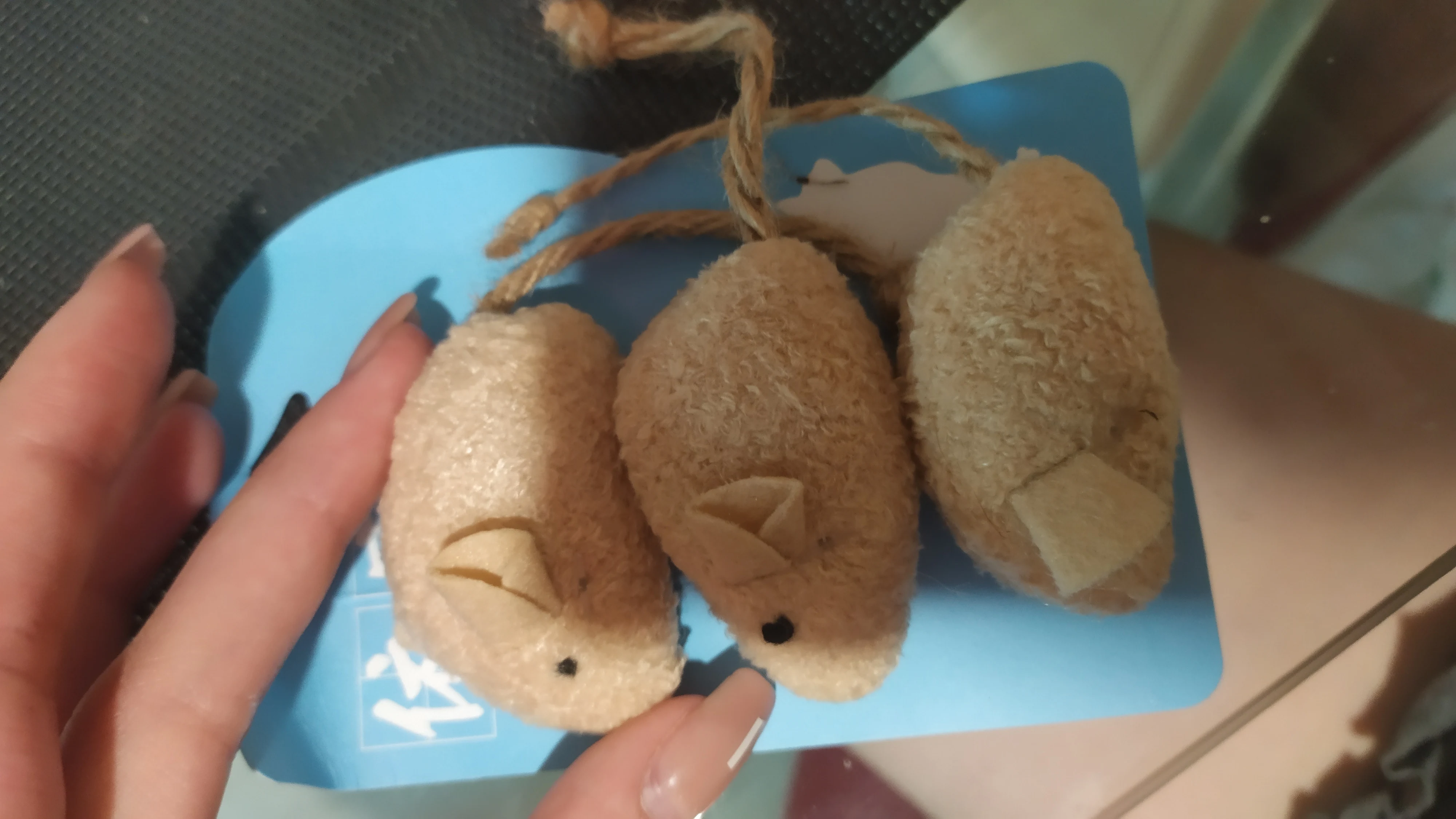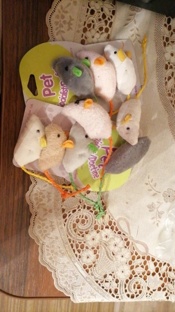 Очаровательные мышки. Понравились и мне и кошкам. Сначала коты вообще с ними не расставались, сейчас прошла неделя и энтузиазма поменьше, но периодически все равно играют. Усиленно пытались выдрать мышам хвосты и уши, но ничего не вышло. Все до сих пор на месте, швы не разошлись, только хвостики немного раскрутились, что вообще не страшно.