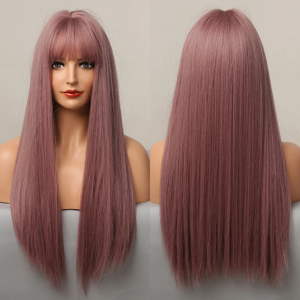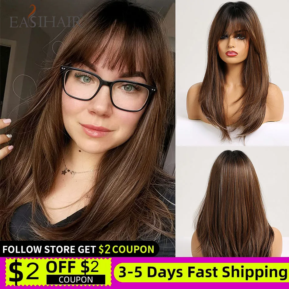 Парики из длинных прямых волос с челкой, черные и коричневые, термостойкие, с эффектом деграде