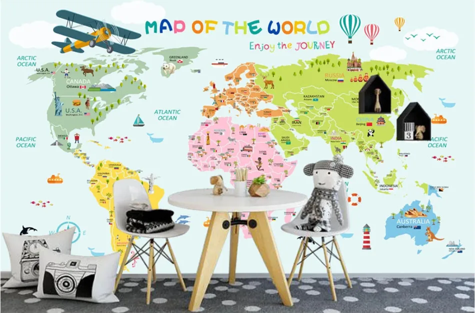 Пользовательские мультфильм карта мира Настенные обои для детской комнаты стены 3D современная детская комната настенное покрытие обои домашний декор
