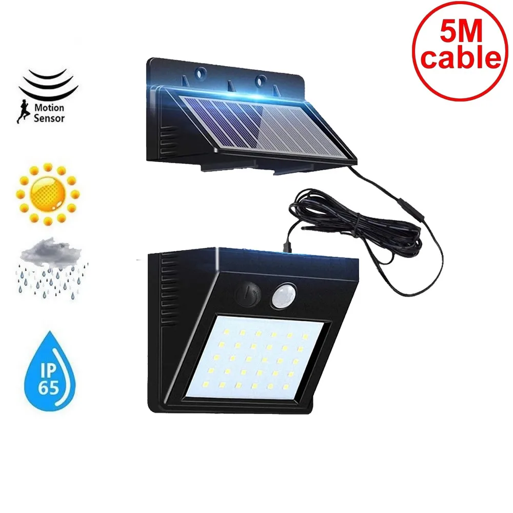 Новое поступление, интегрированный и раздельный монтажный светодиодный светильник на солнечной батарее, 30 светодиодов, 500 лм, супер яркий светильник на солнечной батарее с датчиком движения + компакт-дисков, Солнечный настенный светильник на солнечной батарее для внутреннего, уличного, ландшафтного, лагеря, гаража, двери, ограждения и т. д., водонепроницаемость и защита от пыли, солнечная панель может расщепляться с лампой и устанавливаться на расстоянии 5 м от лампы