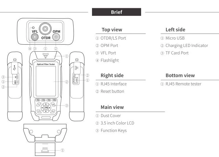 MINI-PRO OTDR Длина волны: 1310 и 1550 нм Динамический диапазон: 24/22 дБ диапазон тестирования: 3 м до 64 км 9 функций в 1 устройстве 1 OTDR 2 Карта событий (аналогично EXFO iLOM) 3 оптический светильник 4 оптический измеритель мощности 5 Визуальный дефектоскоп 6 RJ45 Ethernet кабель последовательности 7 Ethernet кабель расстояние 8 Ethernet кабель трекер 9 светодиодный Светильник
