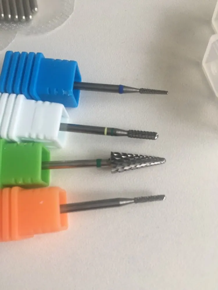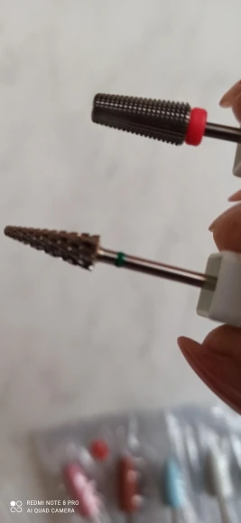 Заказала 3 фрезы. Деньги на выброс. У фрез очень тонкий носик, работать ими нельзя. Резкое сужение фрезы к носику, ещё и тупое. Пилит только широкая часть. Снять покрытие очень проблематично. Проводила тест на бафе - пилит только хвостовая часть. На фото стрелкой указала эту фрезу( всего их 3 шт одинаковые). Рядом для примера какая должна быть фреза - в магазине именно показаны такие фрезы.