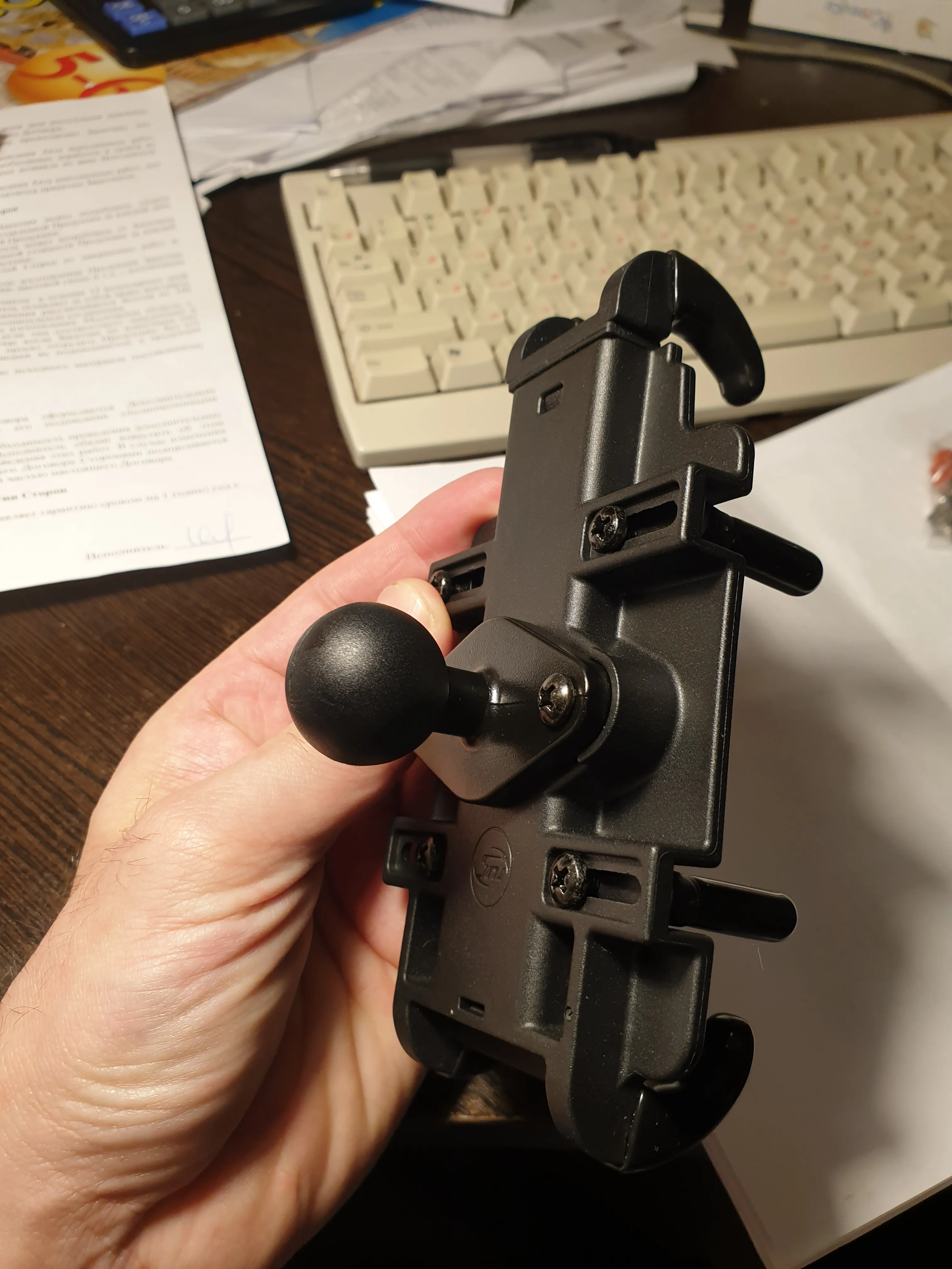 Отличный кредл! Пластик очень крепкий и на вид очень качественный. На вид слабоваты боковые упоры, но они нужны только для центровки телефона, даже без них будет очень плотно держаться. Шарик для РАМ крепления из алюминия и резины, держится в зажиме четко и без проворотов.