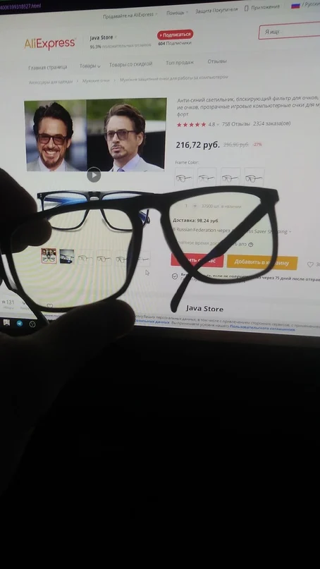 Очки пришли довольно быстро. Упаковка вообще не о чём, но пришли целые. При надевании слегка желтят изображение. Лично мне плохо подошли - глаза начинают болеть после непродолжительной носки. Линзы простые, т.е. без диоптрий.