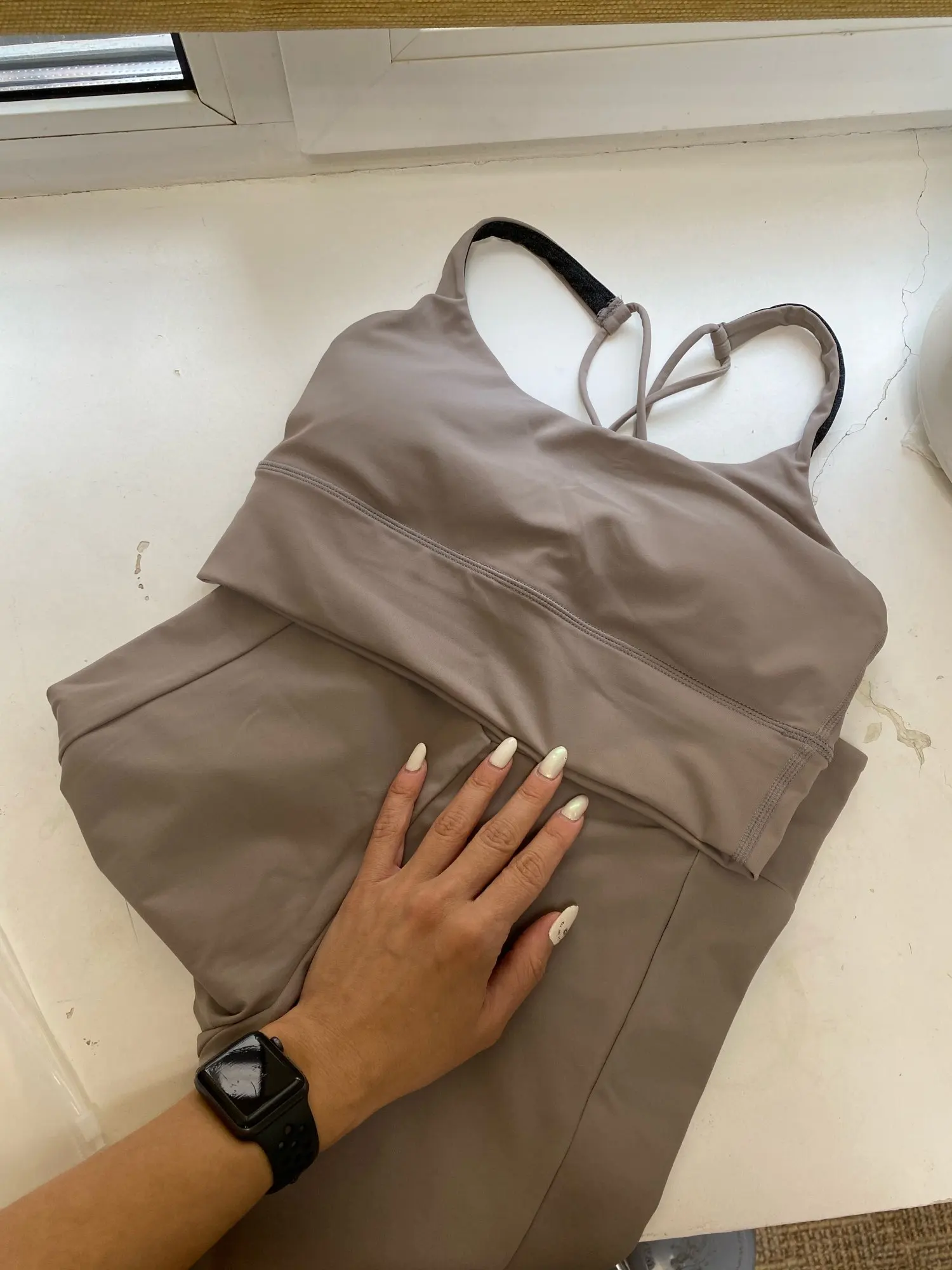Очень классный комплект! Материал очень-осень приятный и комфортный. Легинсы как я и хотела на талии, выше пупка, но носить нужно с бесшовным бельём . Лиф тоже отличный, на подкладке и с чашками, в грудной клетке не давит, дышать легко) приехал комплект очень быстро, наверно 7-10 дней максимум, я даже не заметила) Что мне не очень нравится всё-таки- это то, что на легинсах очень много швов и они отпечатываются на коже, что не очень приятно. Я, конечно, оценку не снижаю, я видела изначально, что они такие