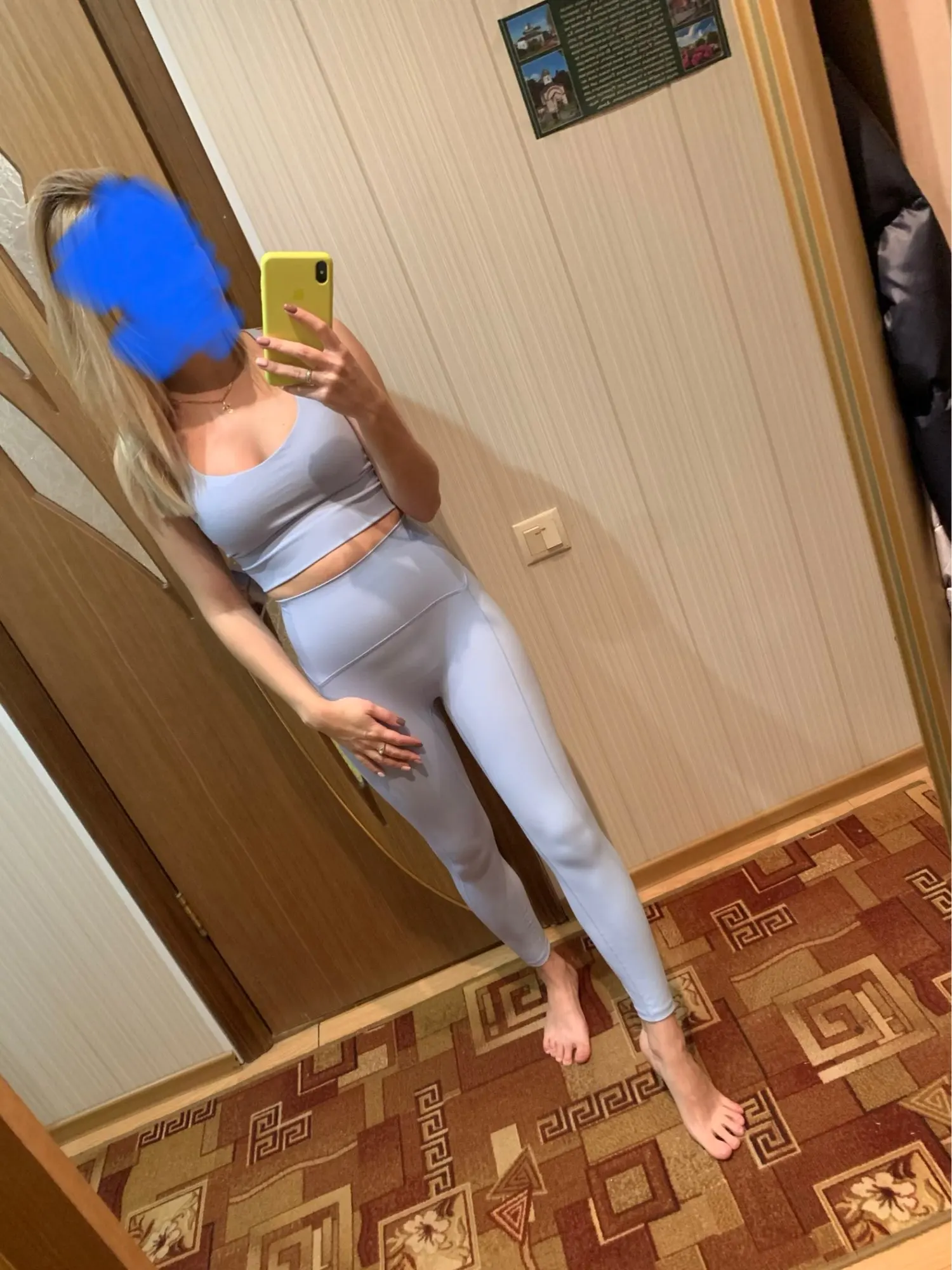 Комплект хороший, но на меня оказался мал. На свой М взяла размер L, леггинсы короткие, топ тесный, можно смело брать на два размера больше